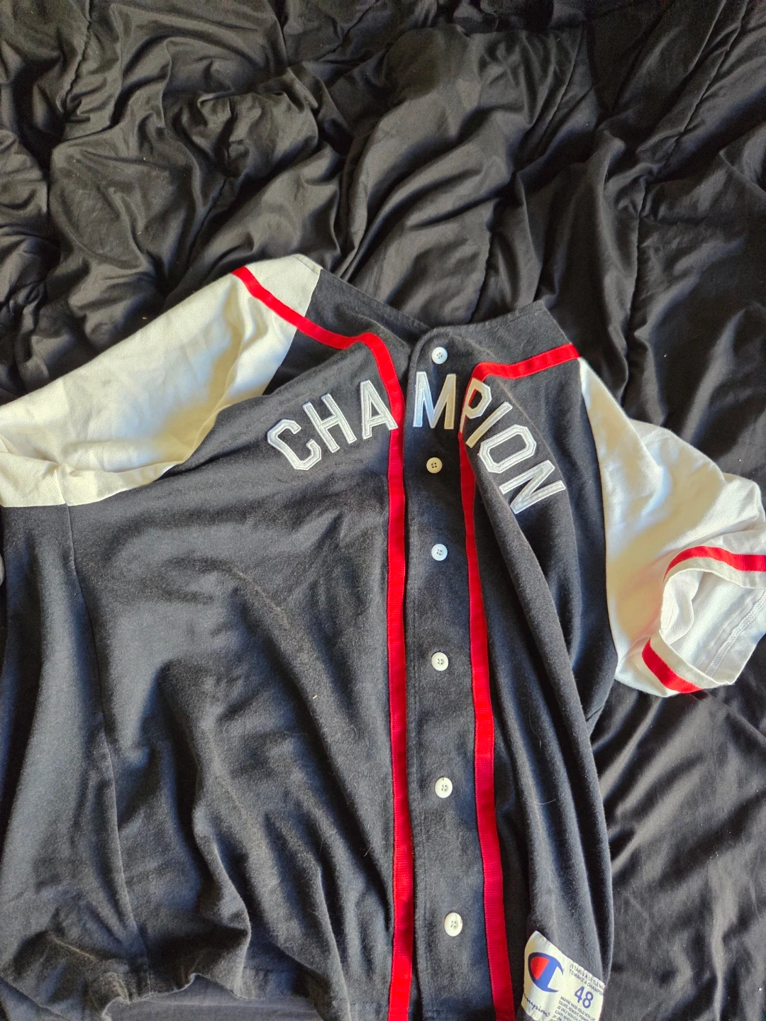 Champion baseball jersey. It's X-Large. Made in Cambodia. Features a button-up front and contrast sleeves.