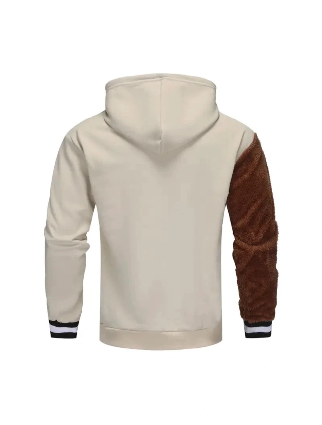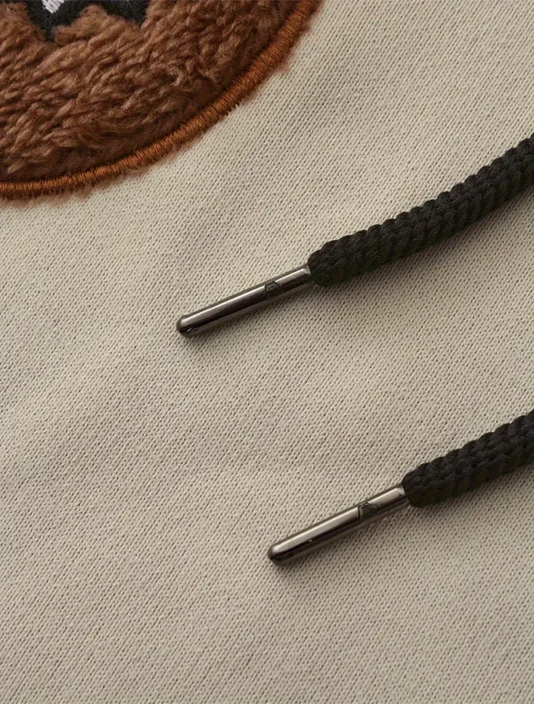 New, unworn, hoodie features a fuzzy teddy bear graphic on the chest with sunglasses detailing. Size M. It has a contrasting fuzzy brown sleeve and ribbed cuffs and hem.