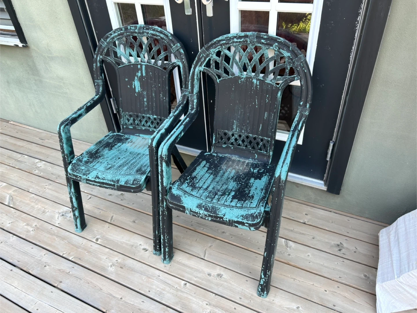Selling a pair of outdoor patio chairs. They show signs of wear and tear, with some paint chipping and fading, but they're still sturdy and functional for your deck or garden! Great for adding some extra seating to your outdoor space.