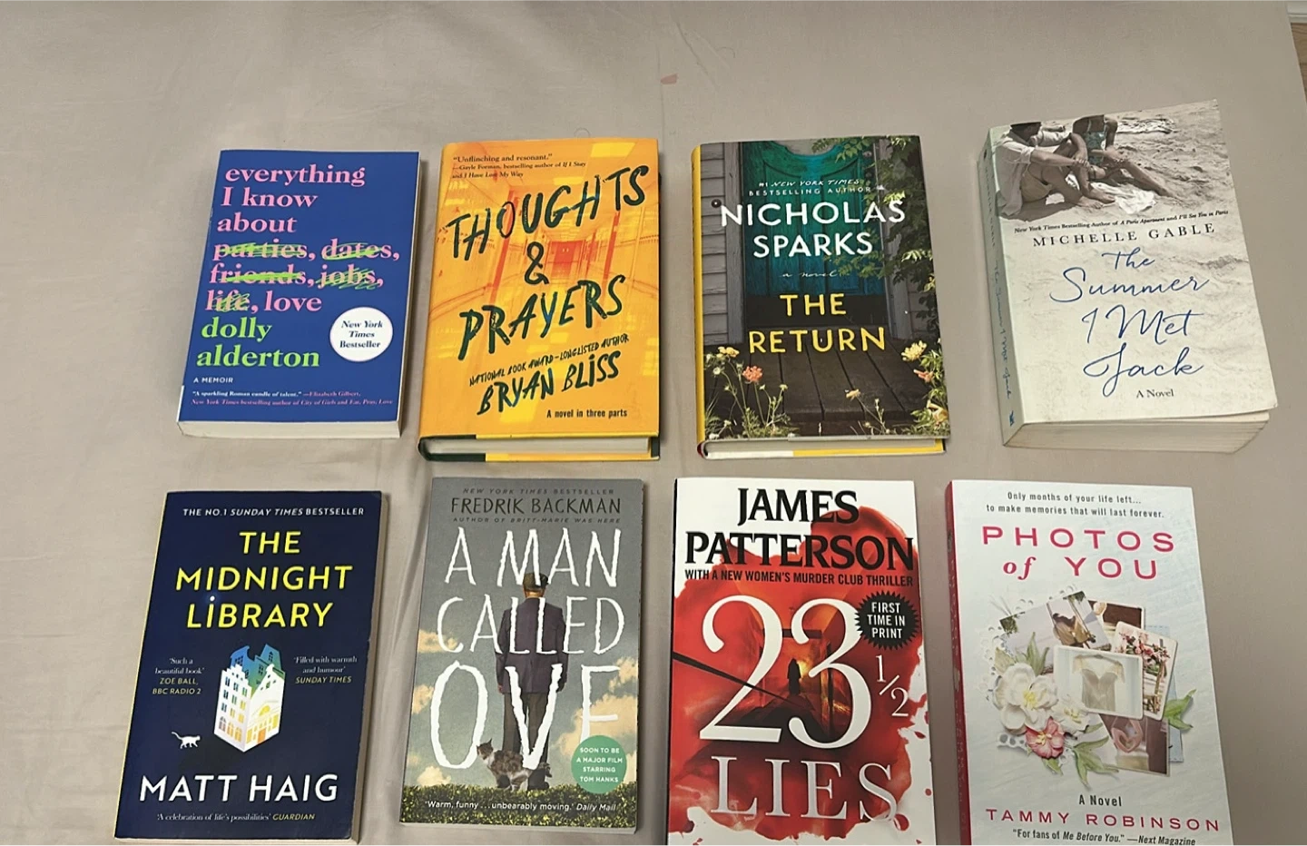 5$5 book each - Selling a bundle of books including: - Everything I Know About Parties, Dates, Friends, Jobs, Life, Love by Dolly Alderton - Thoughts & Prayers by Bryan Bliss - The Return by Nicholas Sparks - The Summer I Met Jack by Michelle Gable - The Midnight Library by Matt Haig - A Man Called Ove by Fredrik Backman - 23 1/2 Lies by James Patterson - Photos of You by Tammy Robinson
