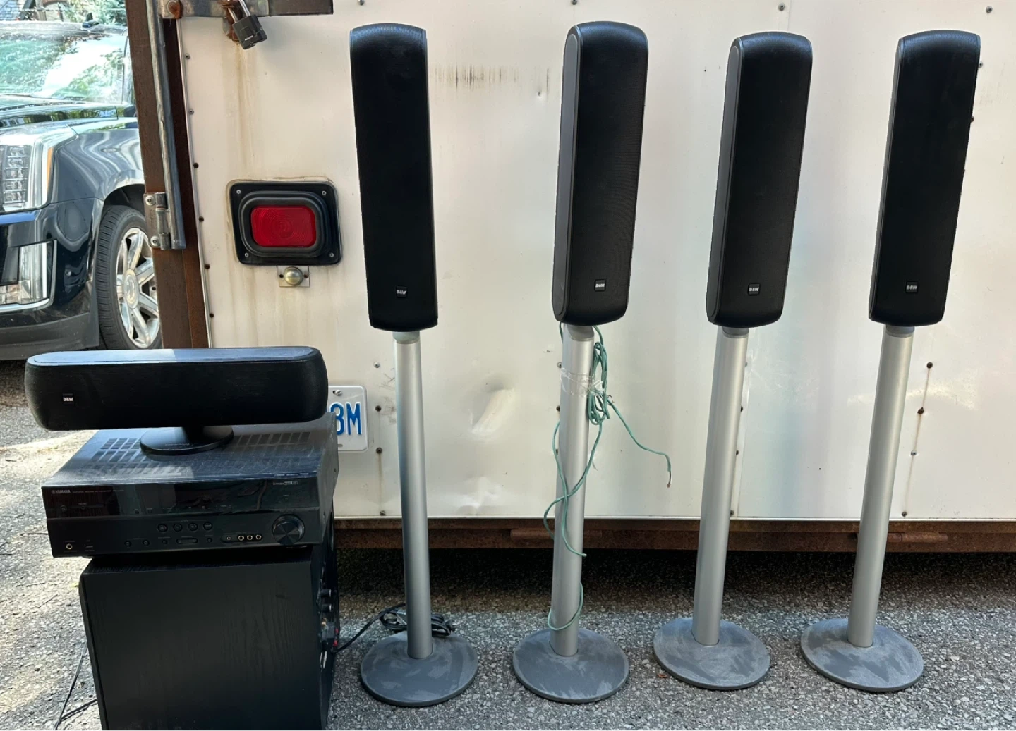 60Selling for a friend who’s downsizing. A bit dusty from storage in his basement but good physical condition. 5 B&W VM1 satellite speakers in Black finish. 4 rare silver floor stands, and the 5th speaker is on a short tabletop stand for use as a center speaker. Perfect for a surround sound system in a moderately sized family room. Floor stands mean that you don’t have to worry about wall mounting, so great for renters. Original cost was $1500 + tax for the speakers, plus the cost of the 4 floor stands, so well over $2000 including tax. Asking only $750. Yamaha surround sounds receiver and Energy powered subwoofer available separately.