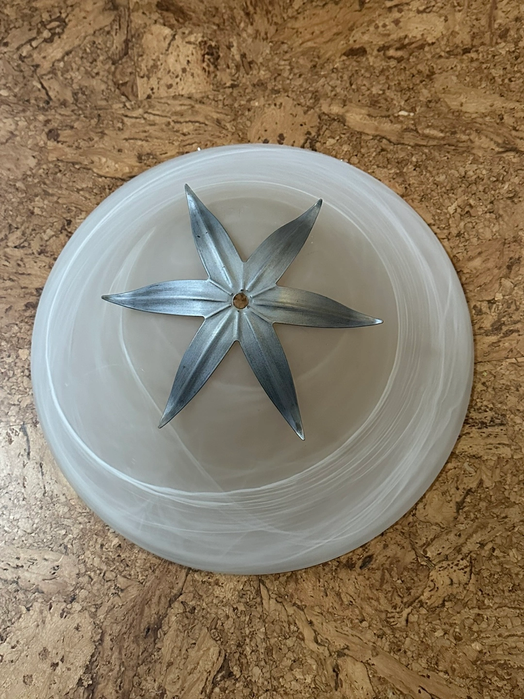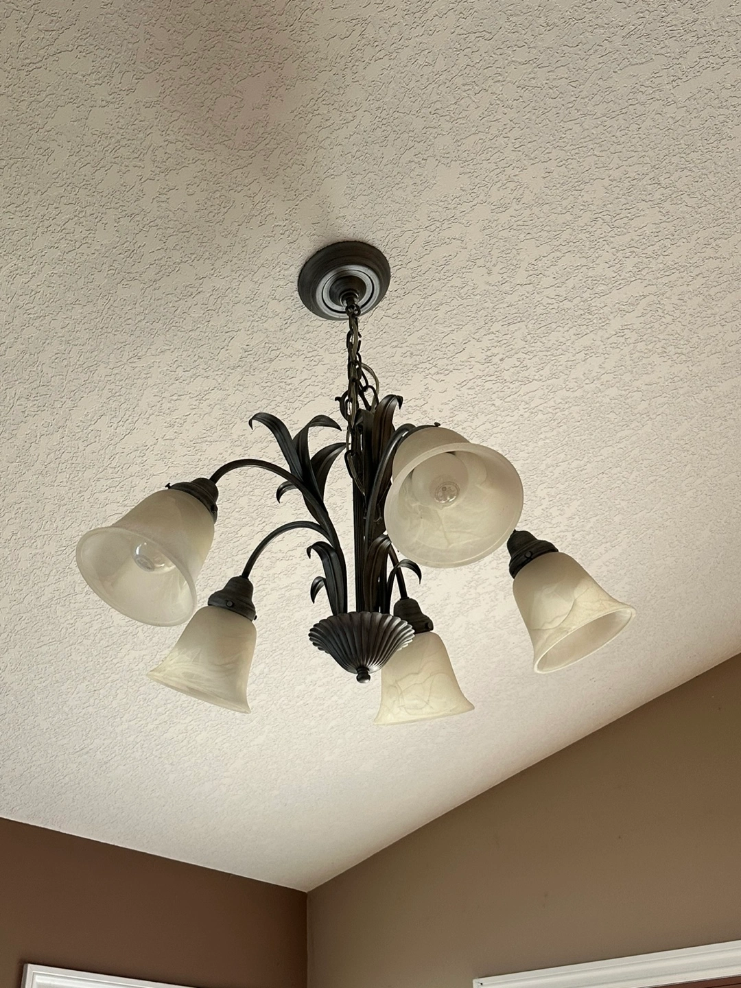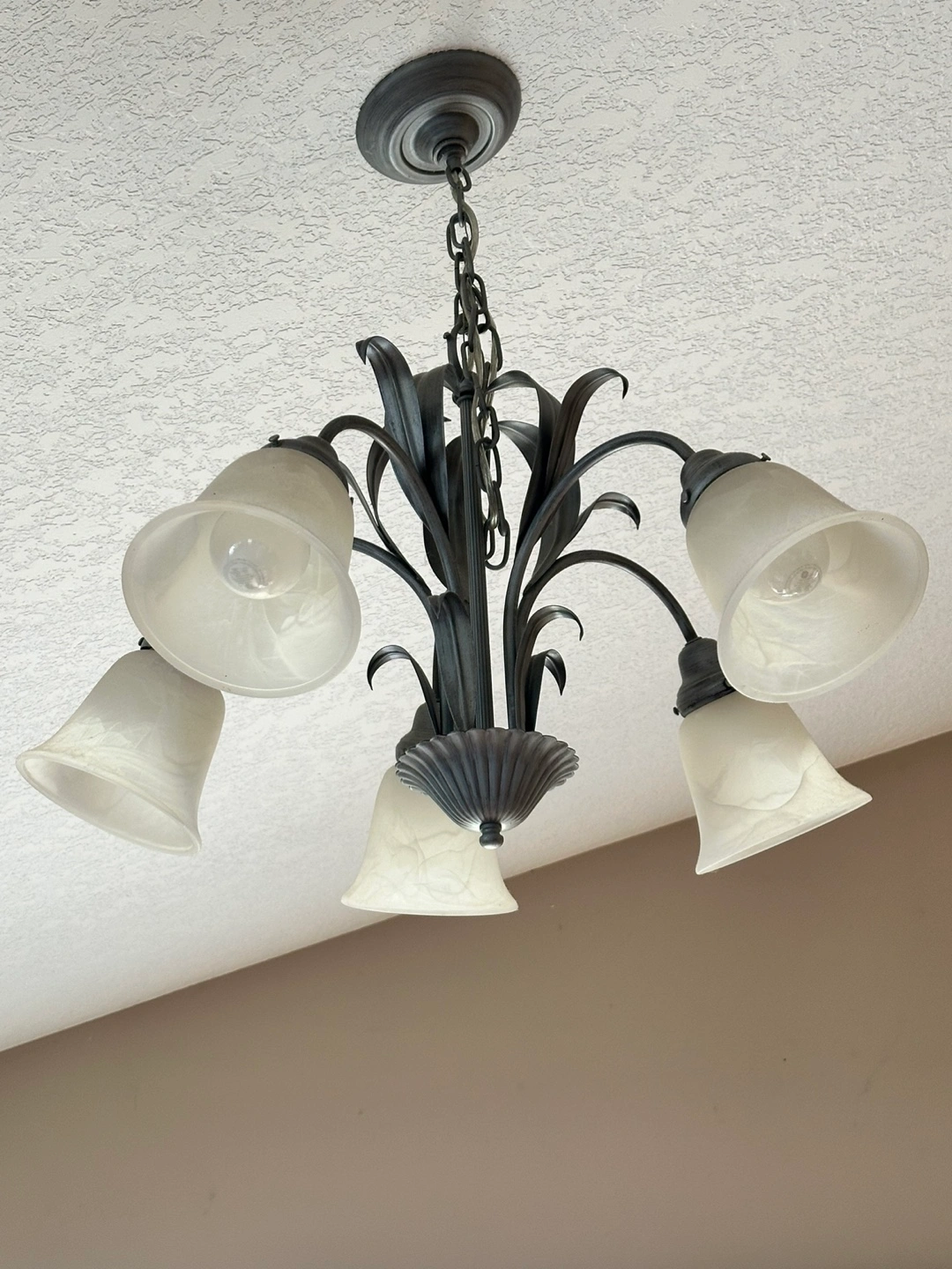 Chandelier with 5 lights and frosted glass shades. Includes ceiling plate and hardware. Includes 5 frosted glass shades.
