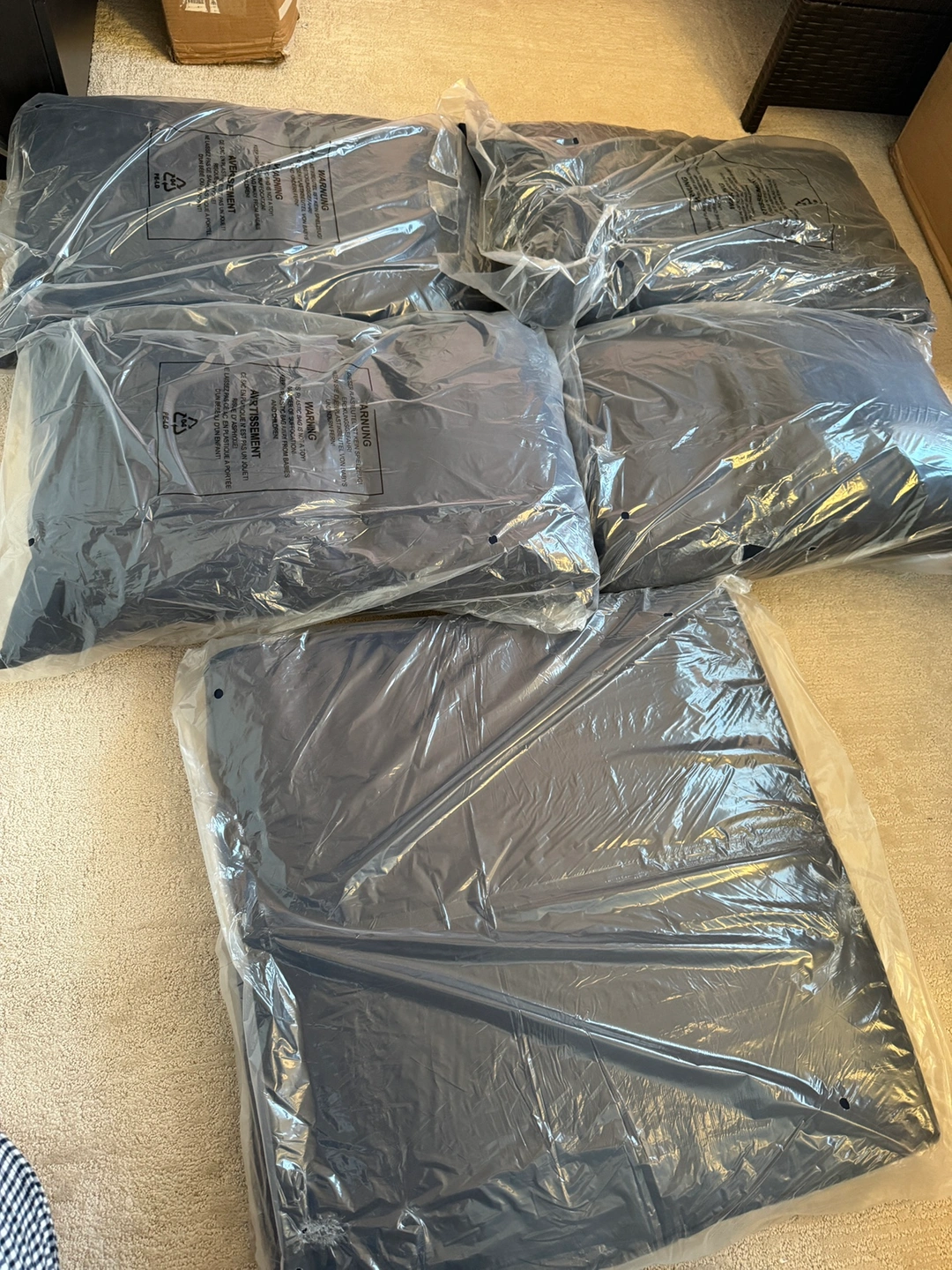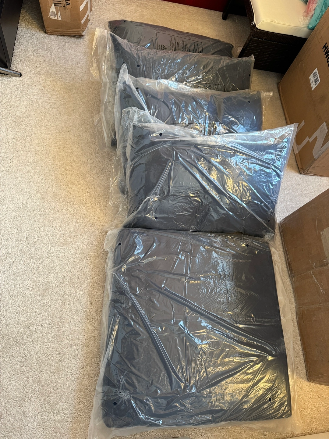5 new patio cushions in navy blue One large size is approx : 25”x25”3” 4 smaller size is approx : 25”x16”x5” Pick up in Richmond close by Walmart or East van close by Grandview and Boundary