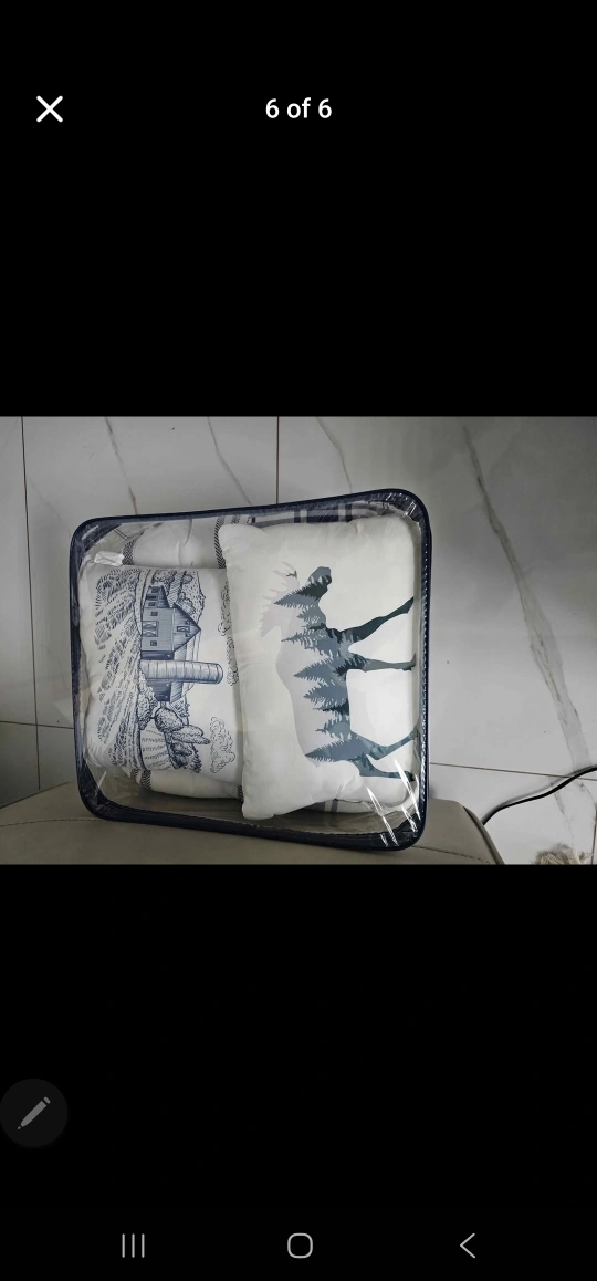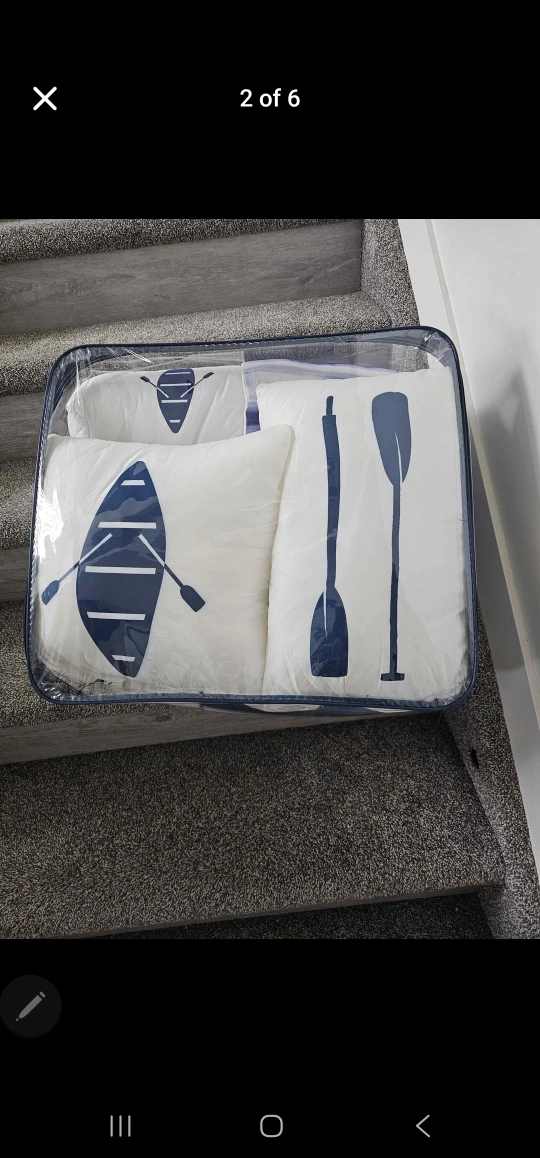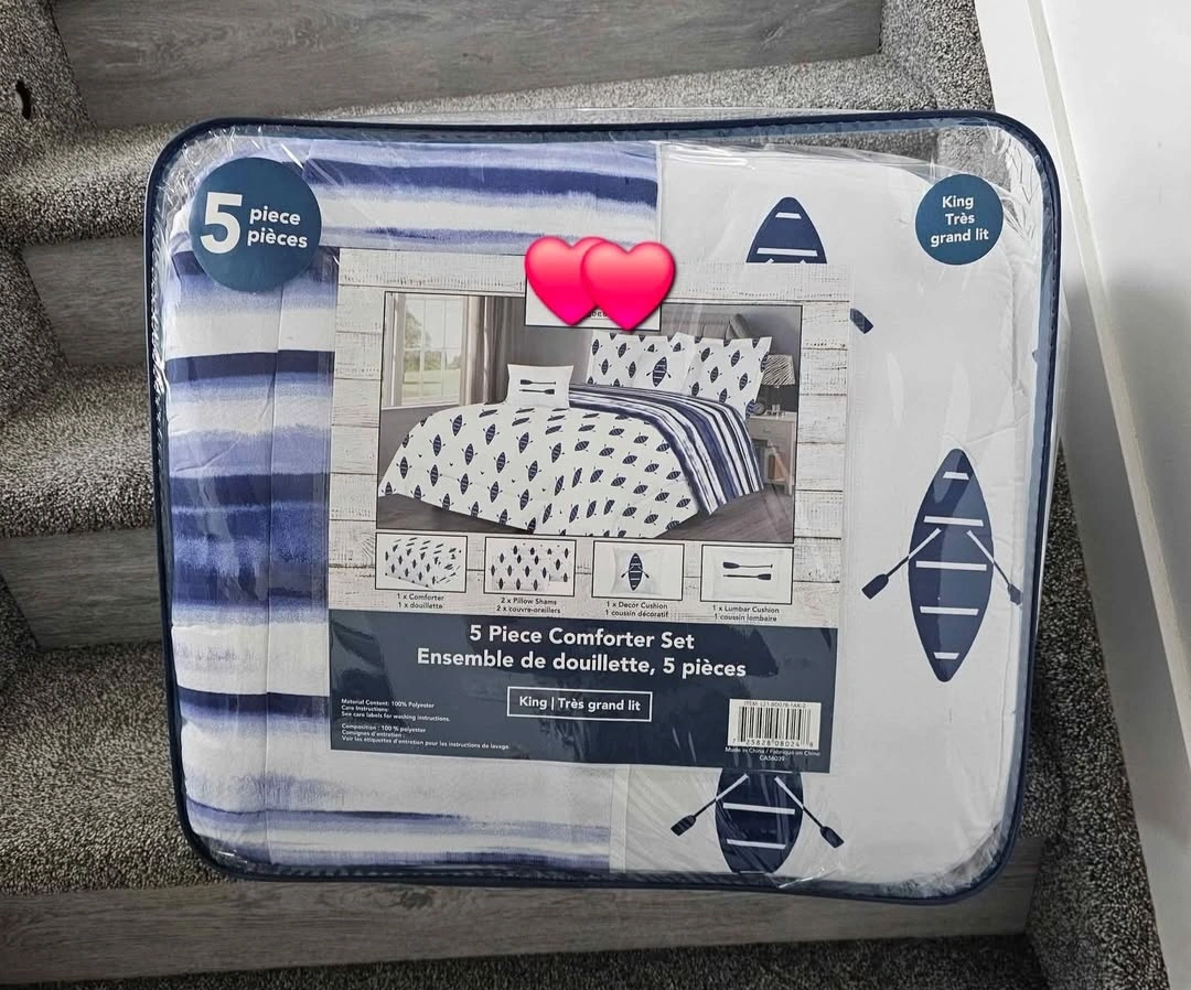 17Brand new 5-piece comforter set in its original packaging! This king-size set includes: - 1 comforter - 2 pillow shams - 1 decor cushion - 1 lumbar cushion Perfect for adding a fresh, clean look to your bedroom!