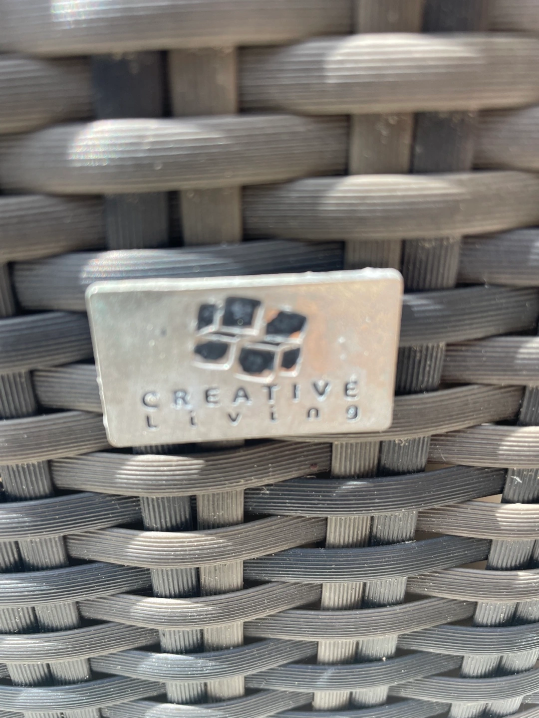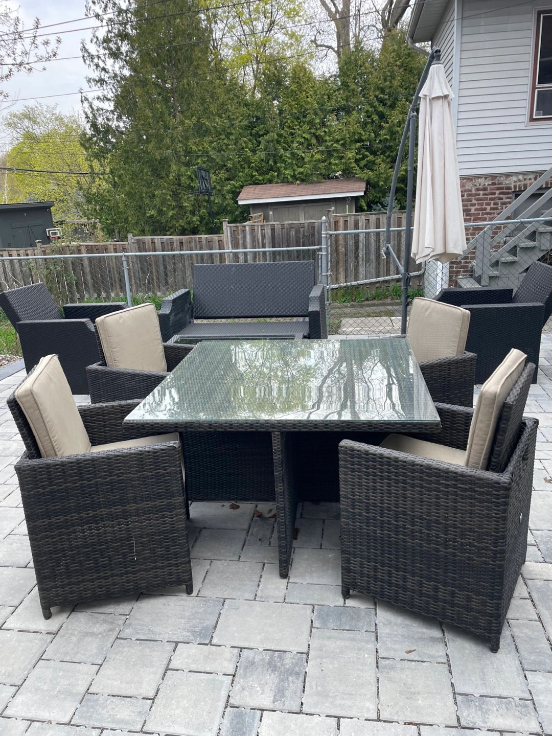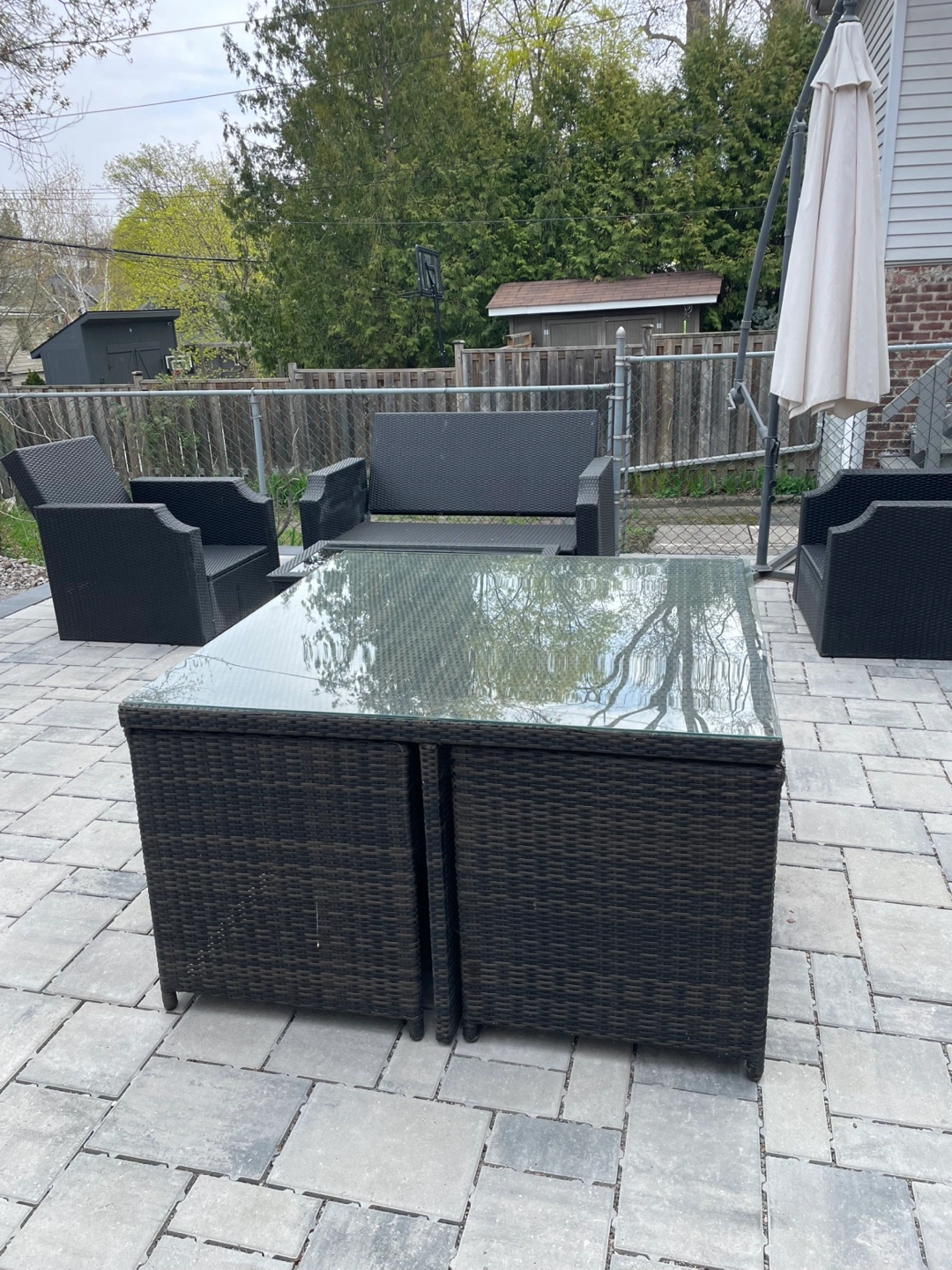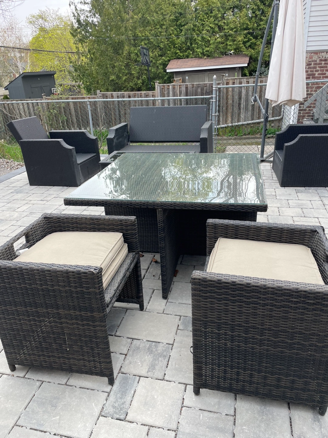 5 piece patio dining set. Brand: Creative Living In excellent condition. Chairs store under the table to keep everything neat and clean. Great for condo or small patio as it self stores in itself. Please see pics and video. $600 or make me an offer. Will not reply to “is this available”. Dining table and 4 chairs only. Not the sofa set in the background. You must pick up. Will need a truck and muscle.