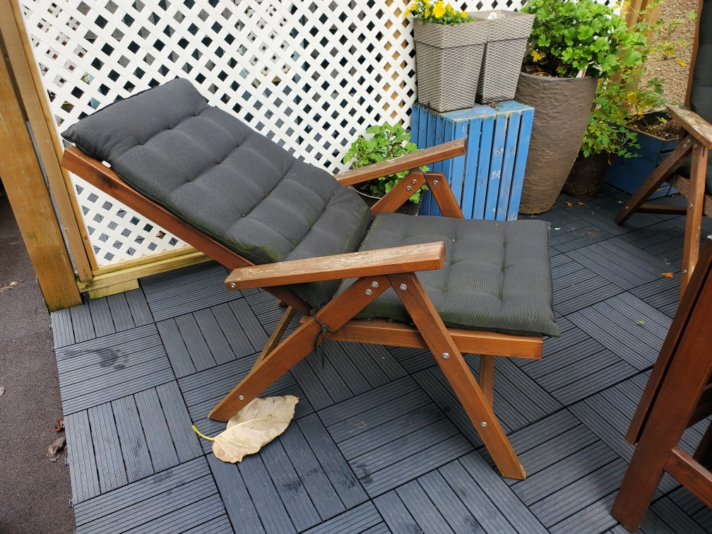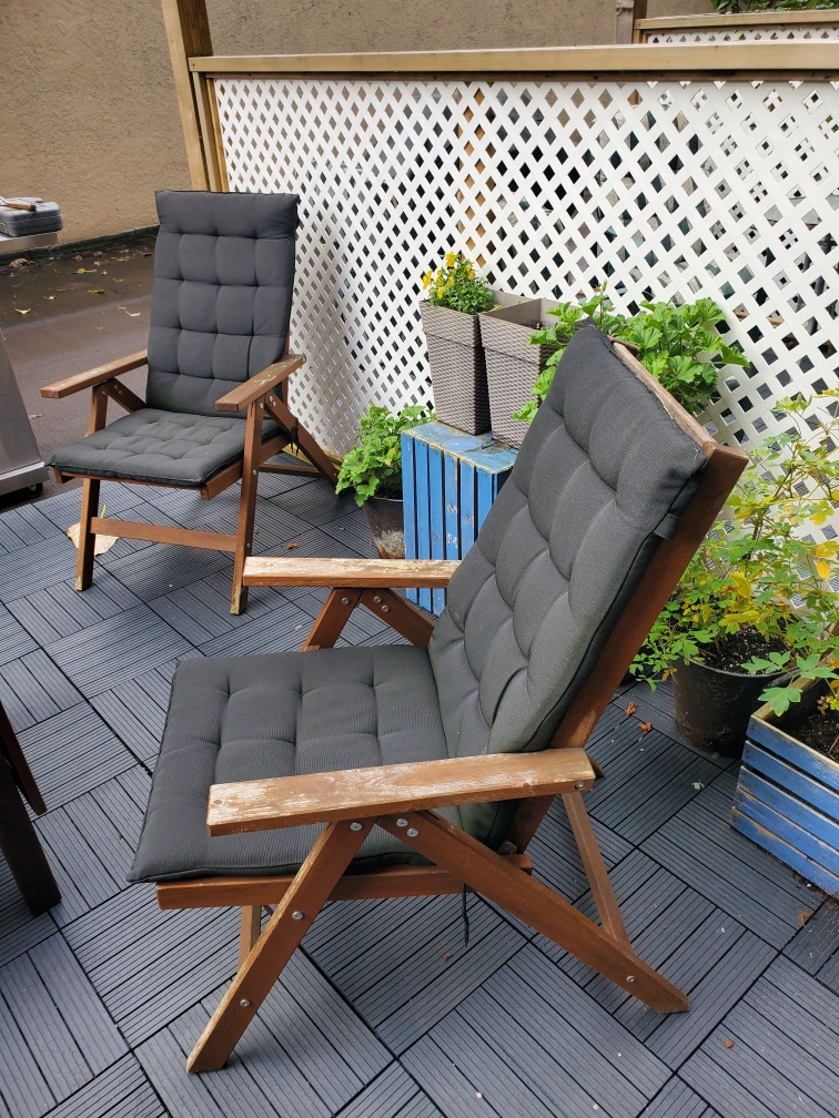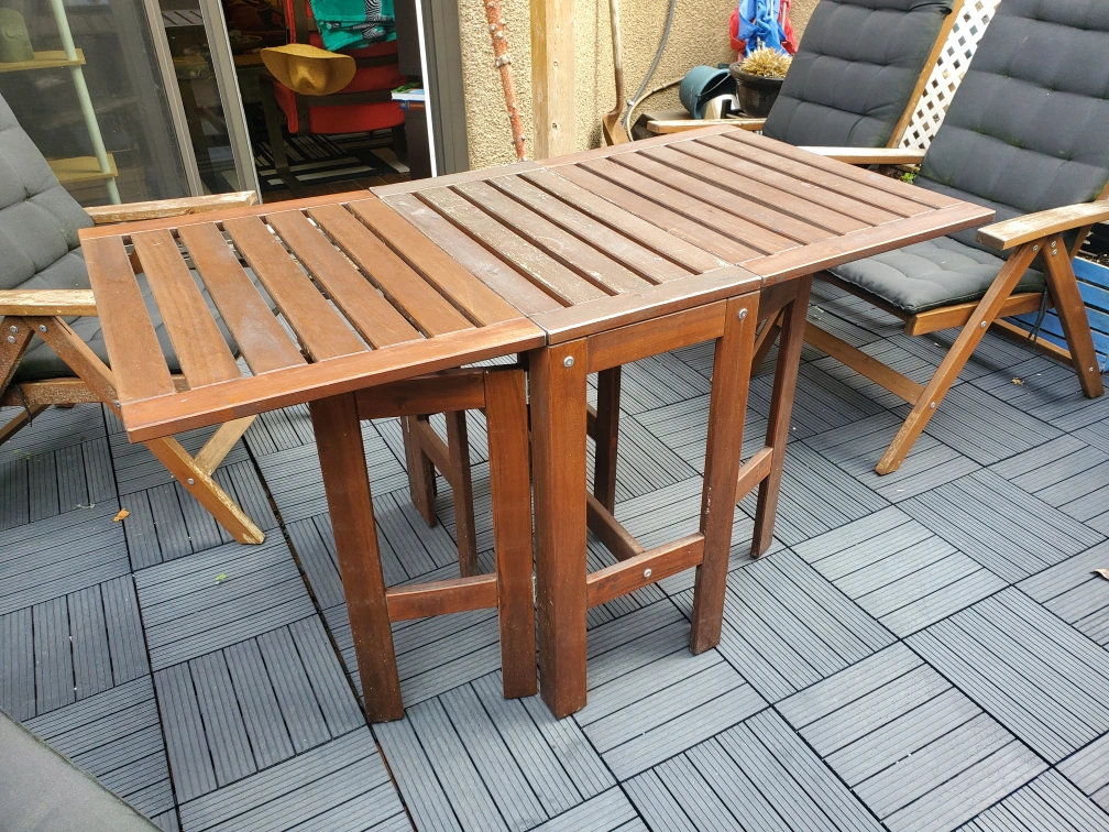 91Includes 4 folding chairs with black cushions, which cab be set to various heights, and 1 fold-down table. Unfold one or both sides for more table space. The finish is wearing off, but the wood is sturdy.