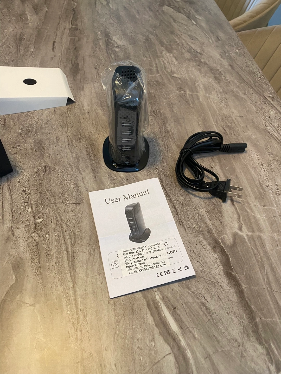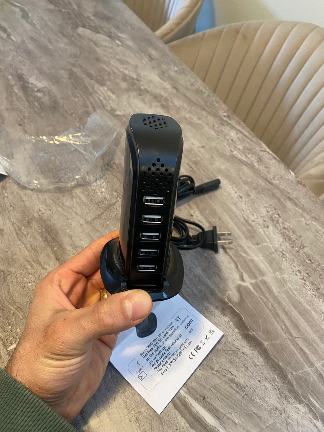Black USB charging station with wireless camera.Five USB ports. Includes power cord and user manual. Compact design. Looks new.
