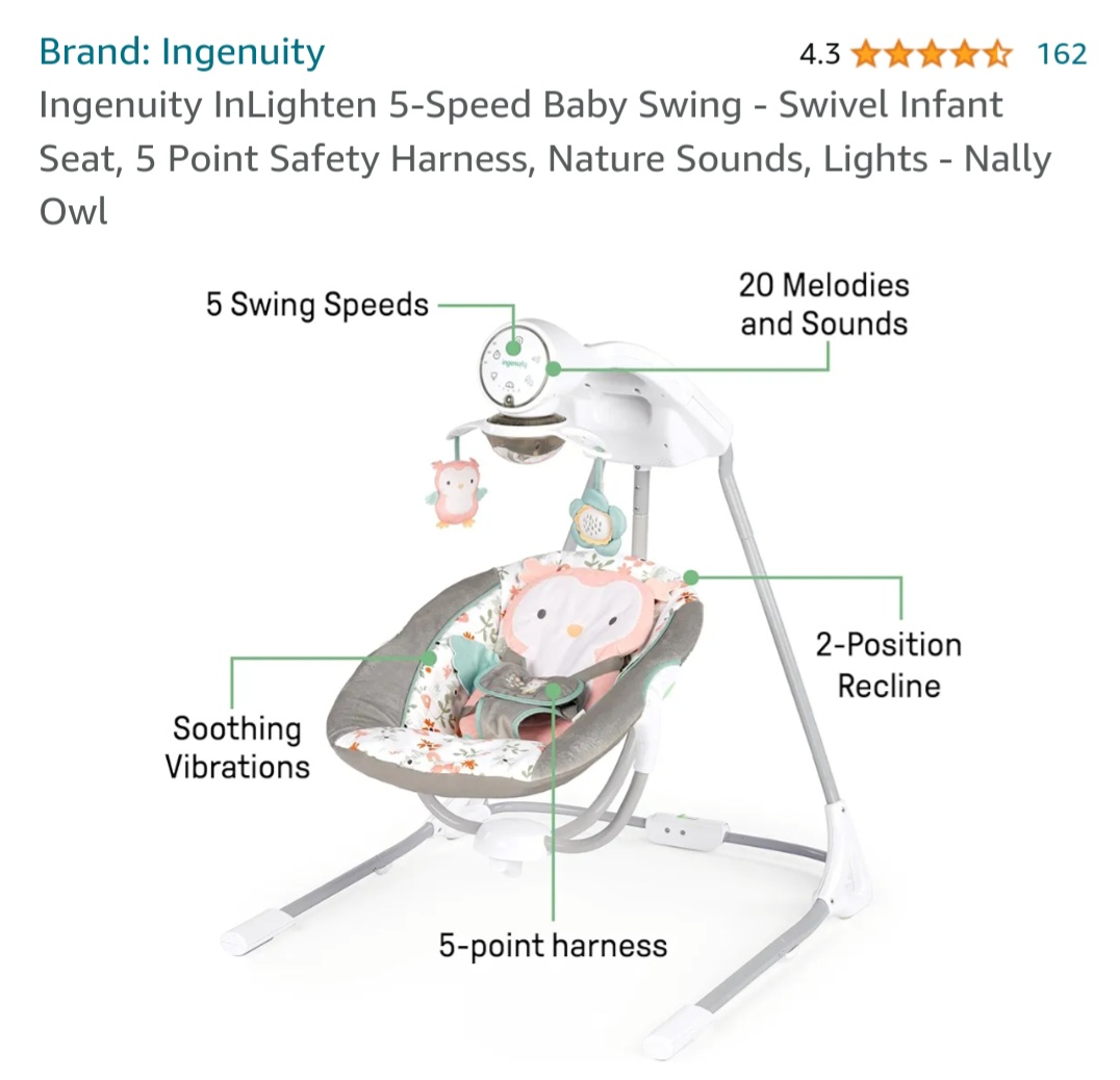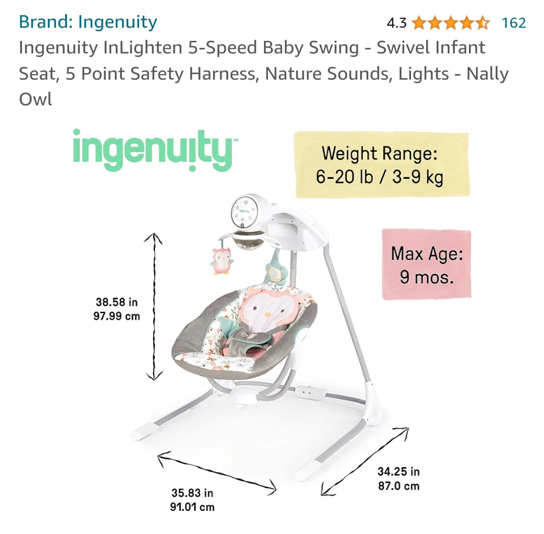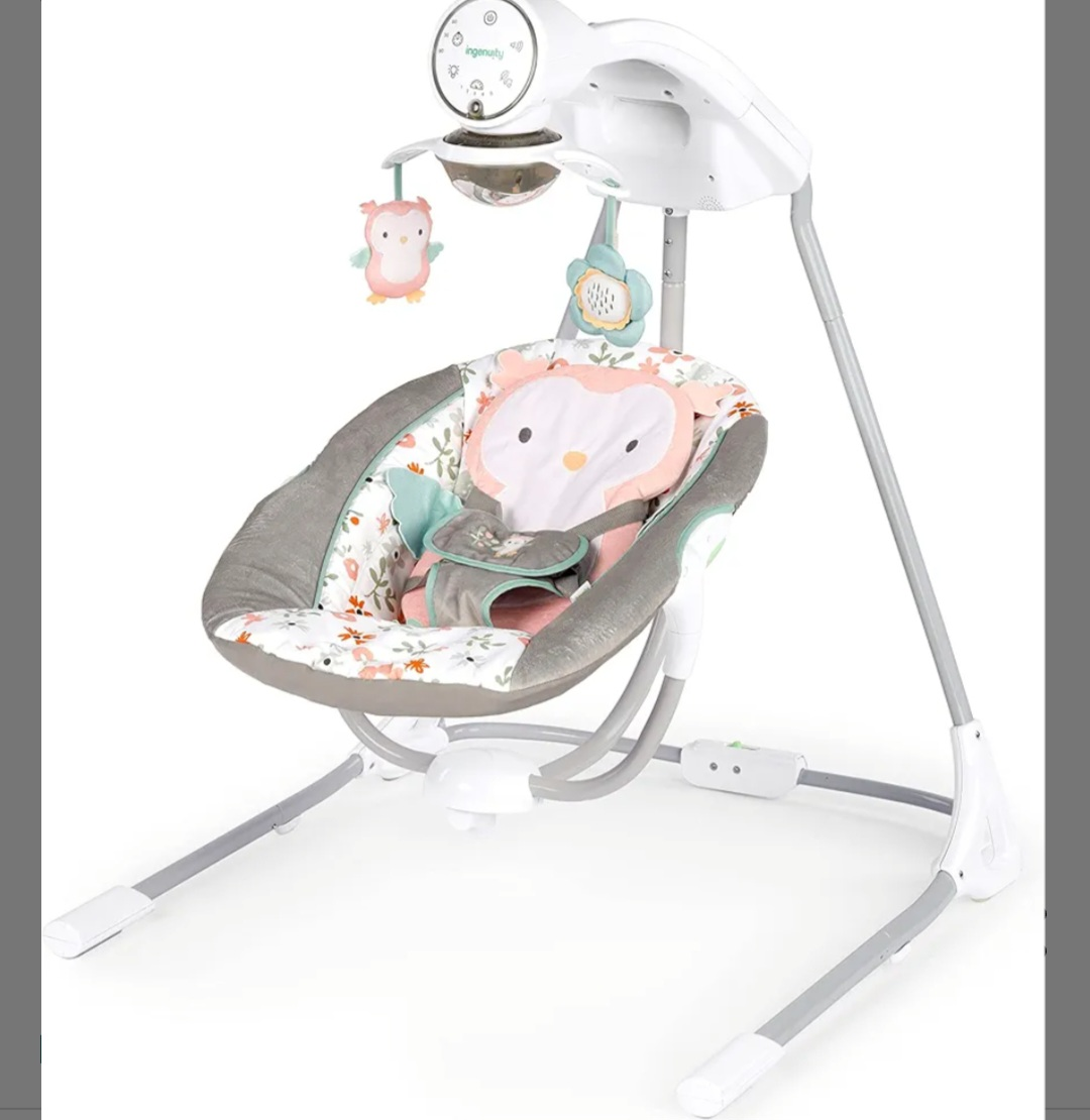 10Ingenuity InLighten 5-Speed Baby Swing - Swivel Infant Seat, 5 Point Safety Harness, Nature Sounds, Lights - Nally Owl https://a.co/d/04S2BnSw like New, only used few times. in box. works perfec. text me if interested 6474091235