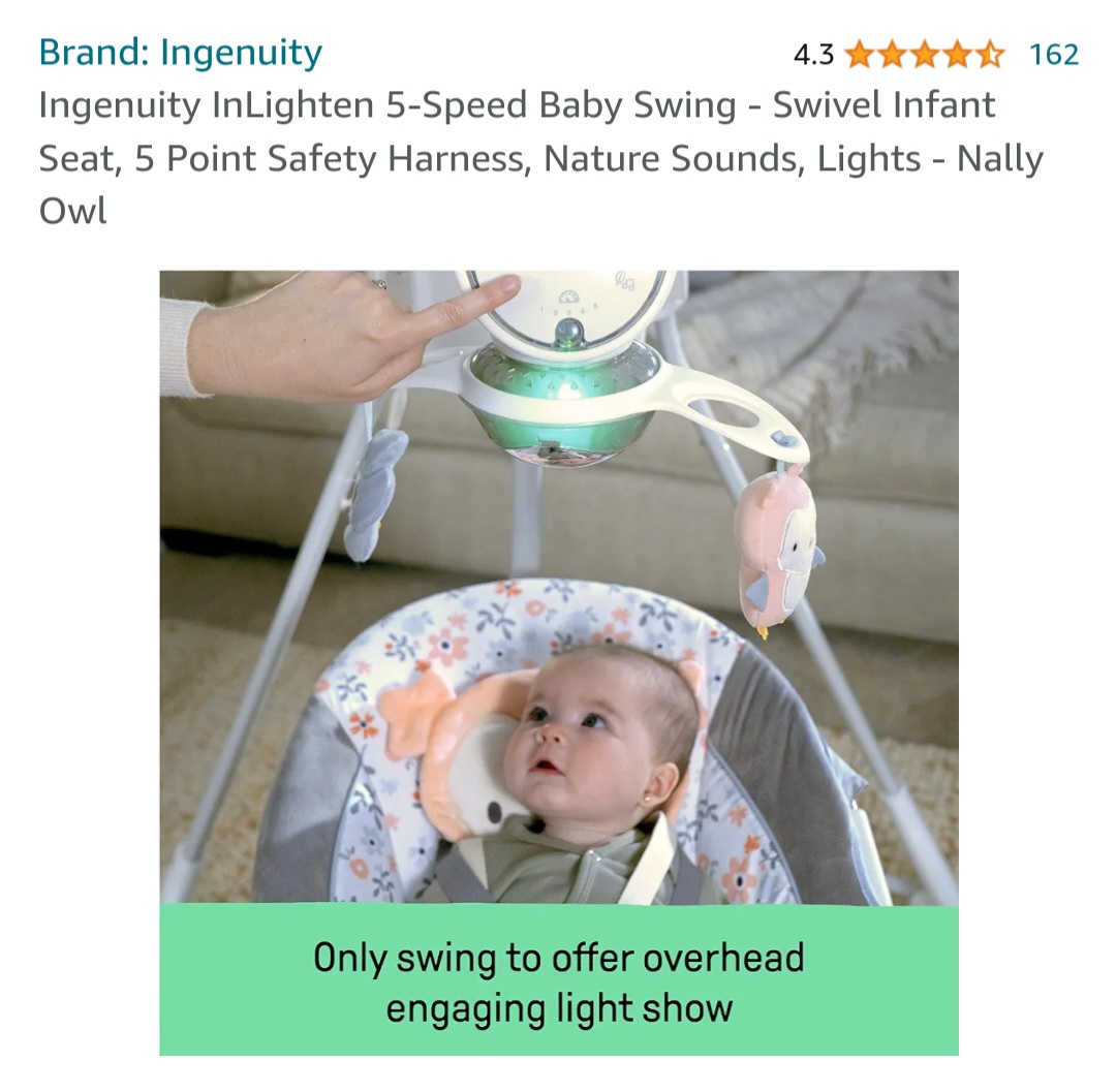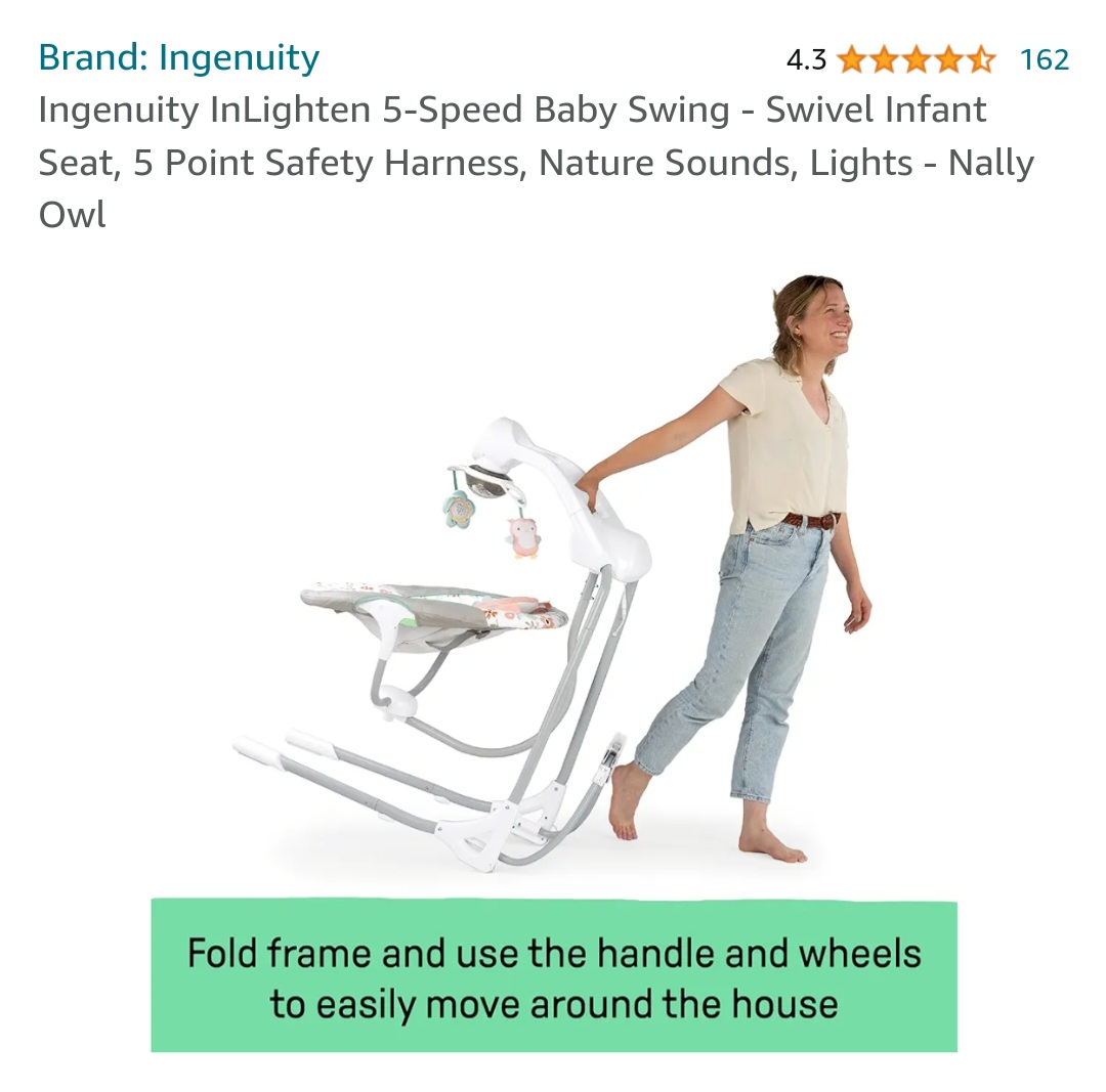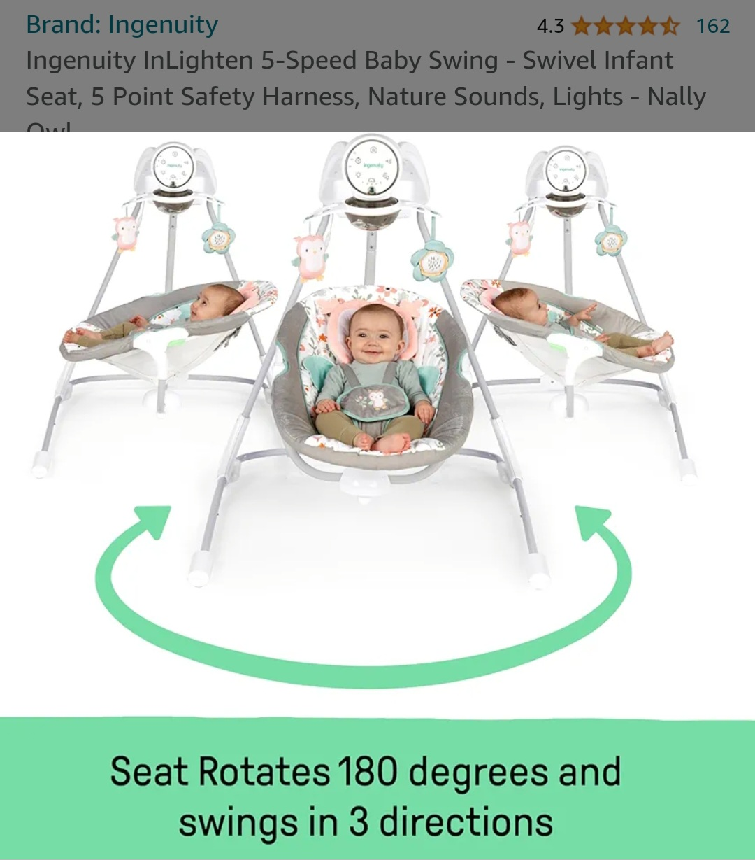 10Ingenuity InLighten 5-Speed Baby Swing - Swivel Infant Seat, 5 Point Safety Harness, Nature Sounds, Lights - Nally Owl https://a.co/d/04S2BnSw like New, only used few times. in box. works perfec. text me if interested 6474091235