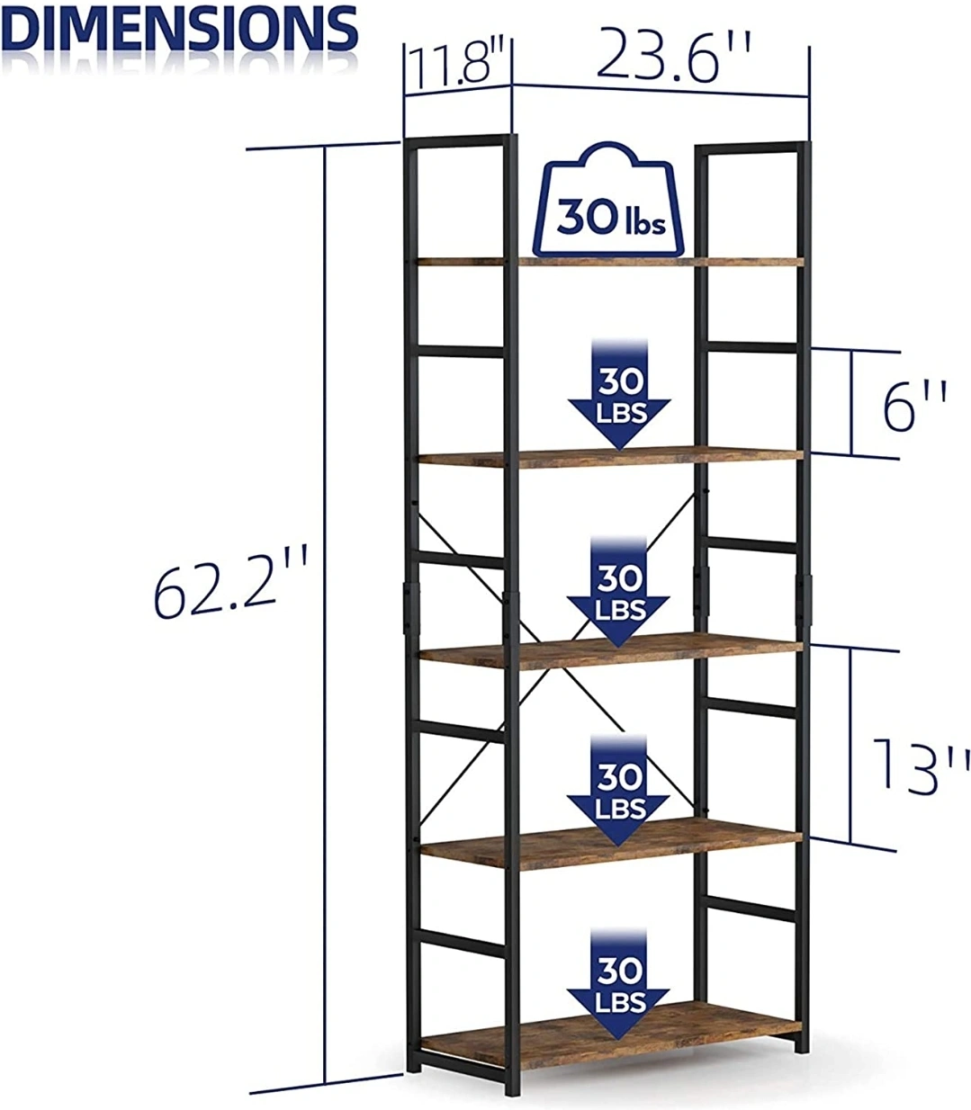 This rustic brown 5-tier bookshelf is perfect for adding storage and style to any room! It features a sturdy metal frame and reinforced rod bracing for stability. The dimensions are 62.2" x 23.6" x 11.8". Each shelf can hold up to 30 lbs. It also includes a fall-preventing safety kit