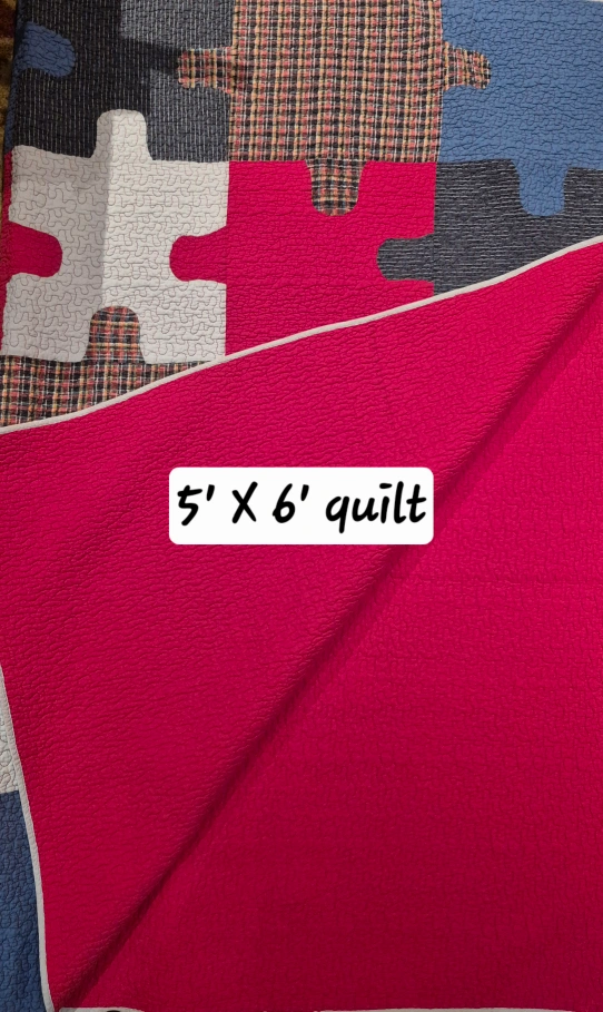 Selling a quilt that measures 5' x 6'. It features a colourful puzzle piece design on one side and a solid red colour on the other. Perfect for adding a cozy touch to any room!
