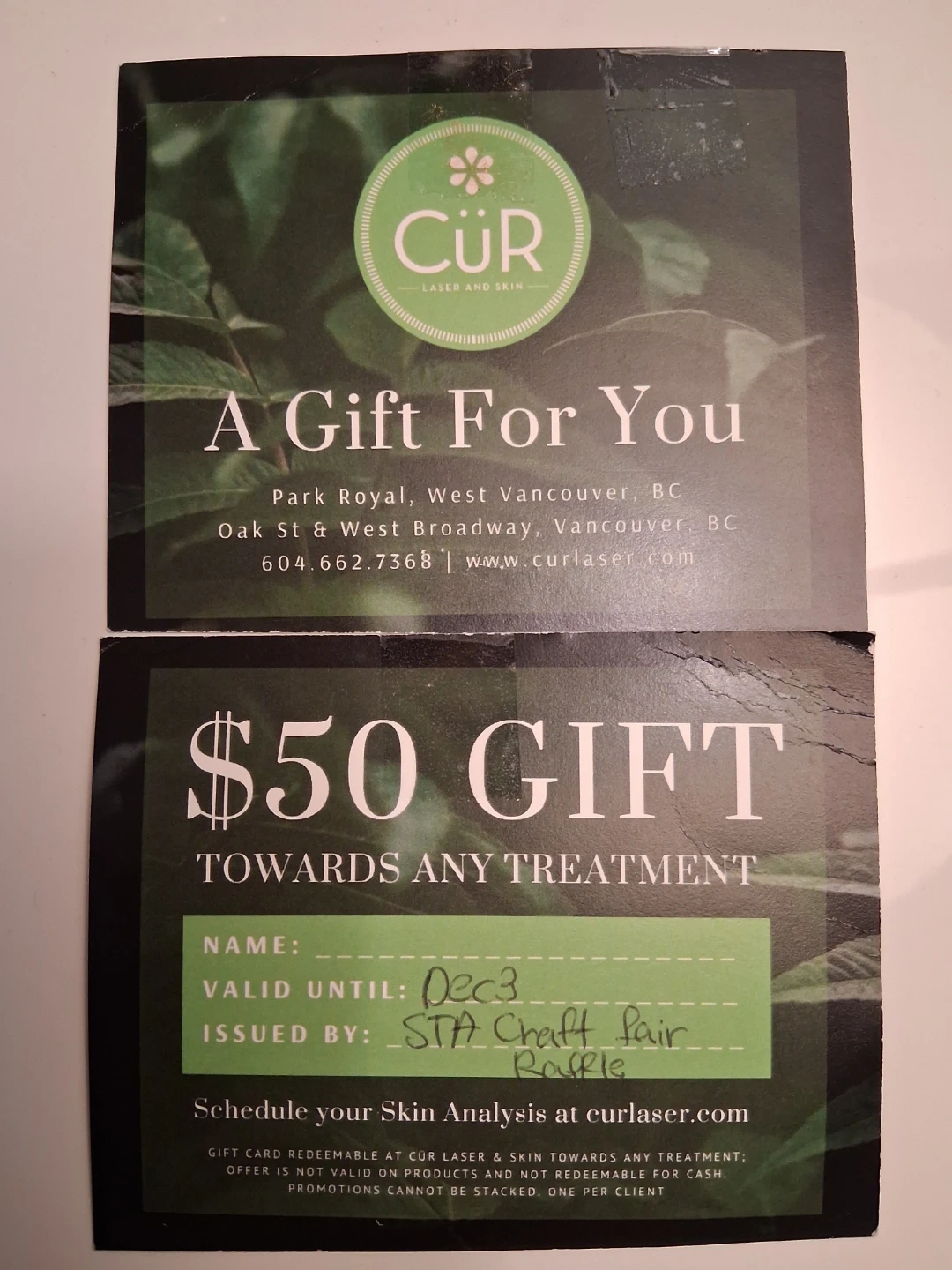 050 % off. $50 dollars Selling a $50 x2 gift card $100 for Cür Laser & Skin, redeemable towards any treatment! Valid until December 3. This would be a great way to treat yourself or someone else to a little pampering