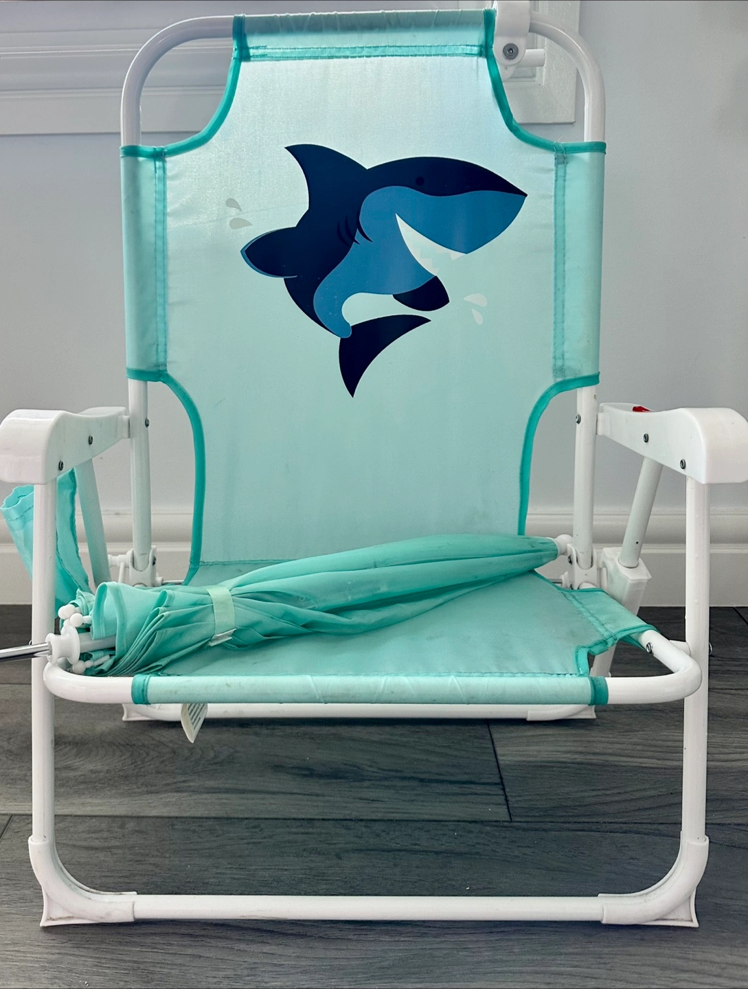 Portable folding chair. Features a fun shark design. Includes a small matching umbrella. Ideal for the beach or poolside.