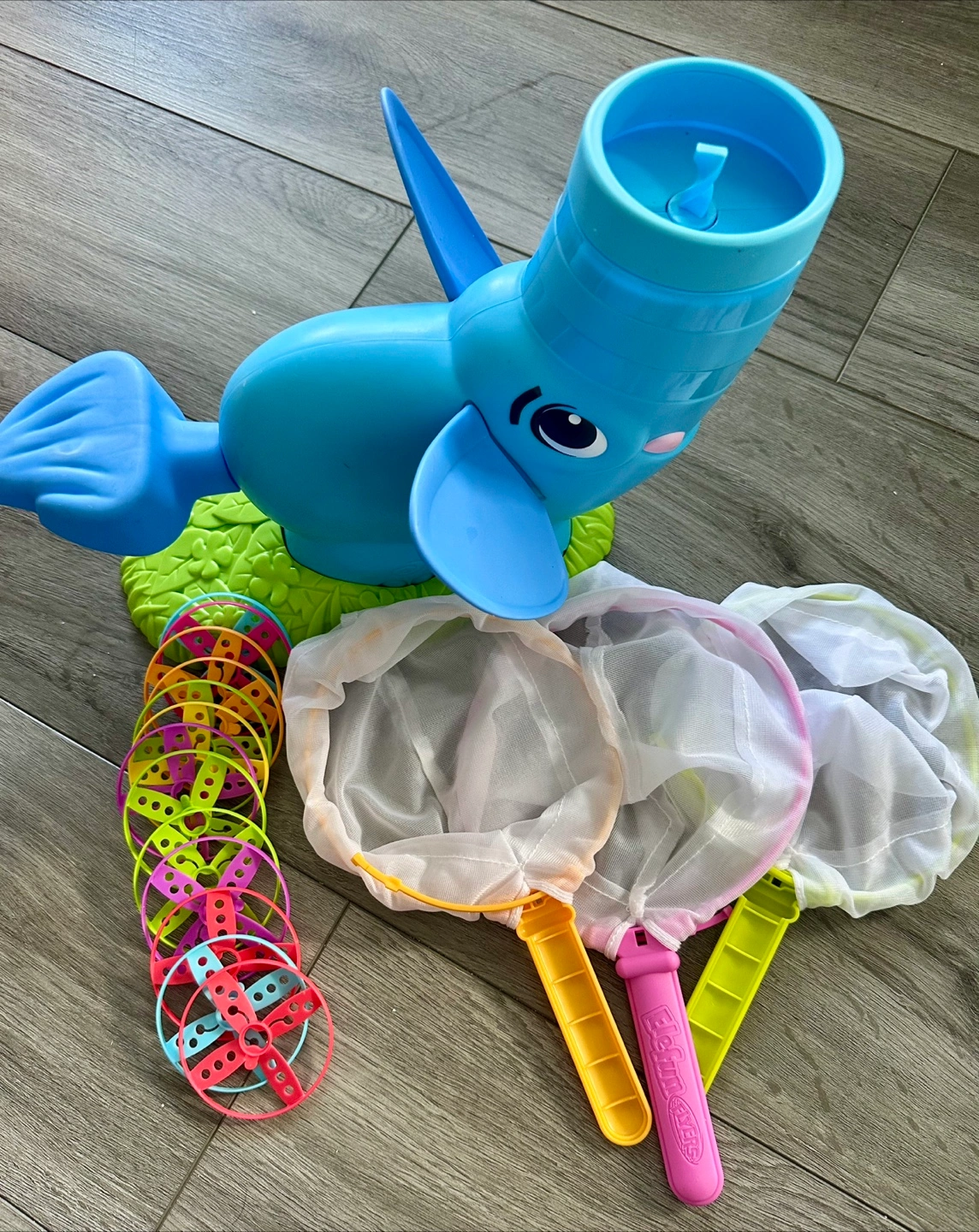 Pre-owned, colourful water toy. Features an elephant water blower and three butterfly nets. Includes colourful spinning water toys. Great for imaginative play.