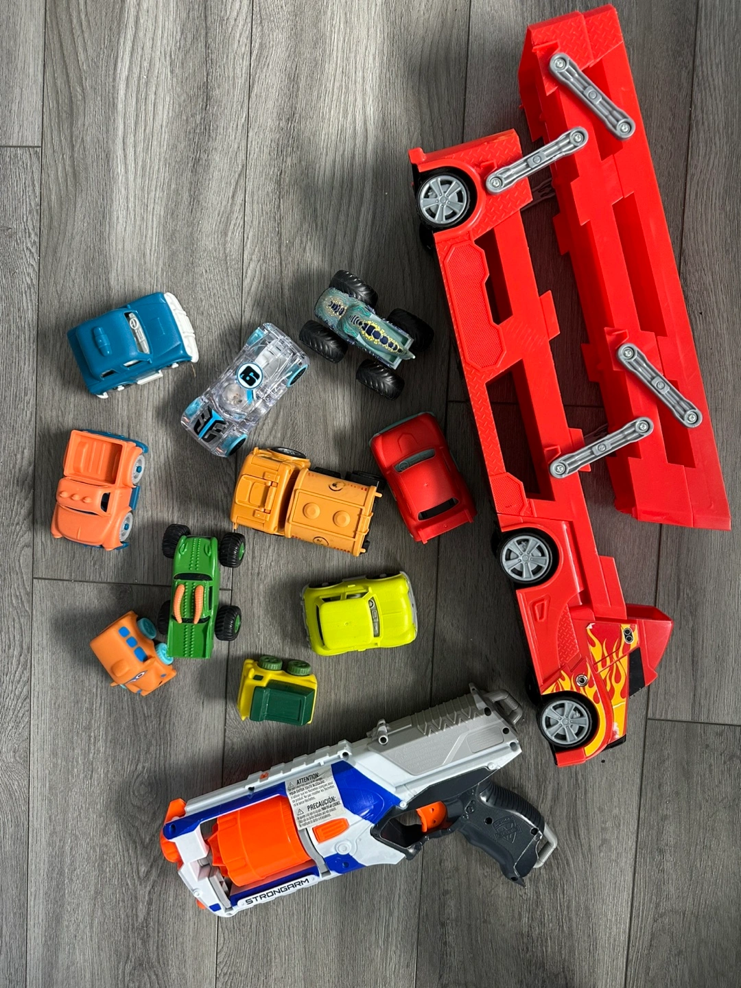 Collection of small toy vehicles. Includes a large red toy carrier truck, several smaller cars and trucks, and a Nerf Strongarm blaster. Great for imaginative play.