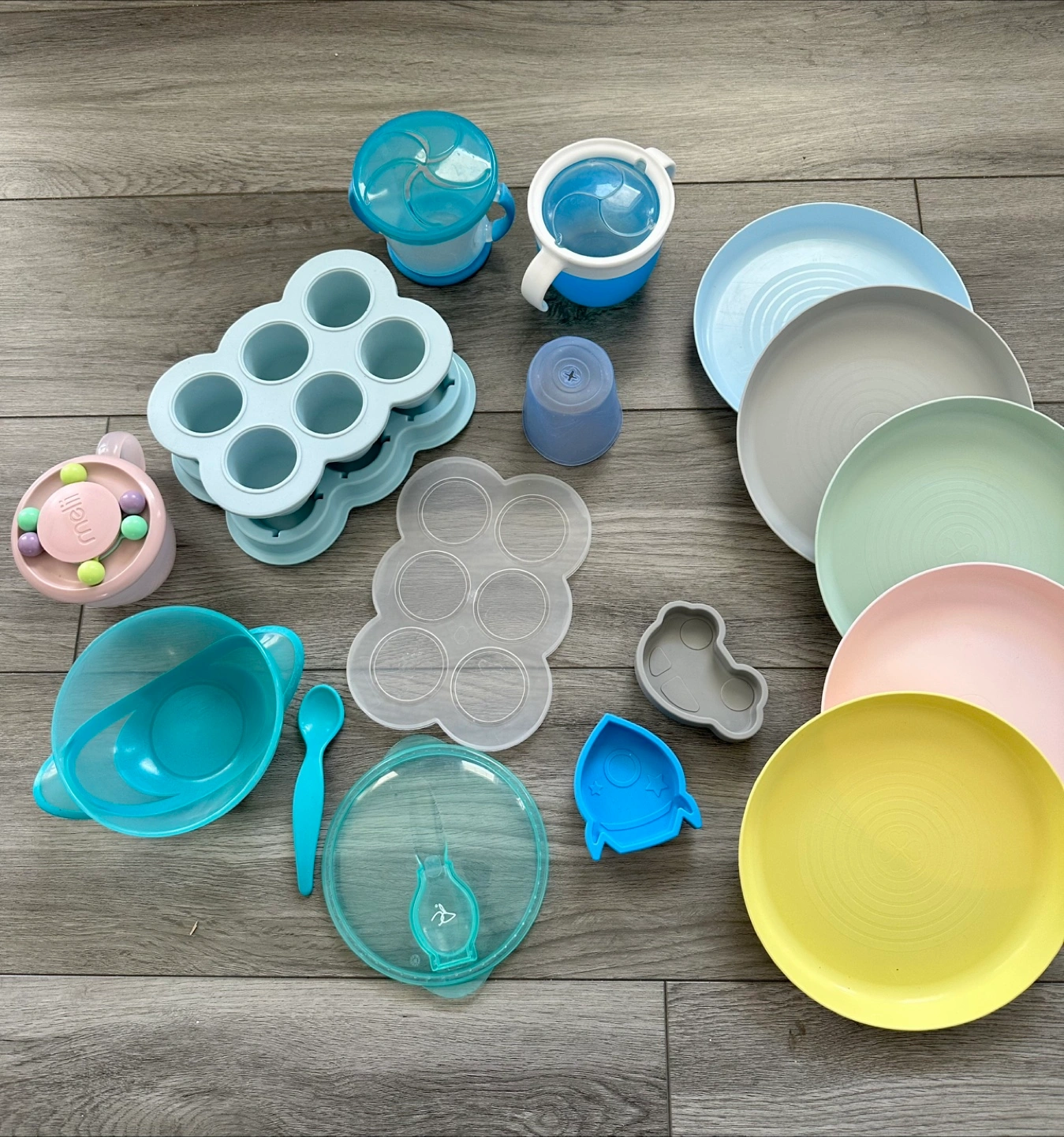 Complete baby feeding set. Includes multiple silicone food storage containers, bowls, spoons, and plates. Perfect for portioning and storing purees and other baby foods.