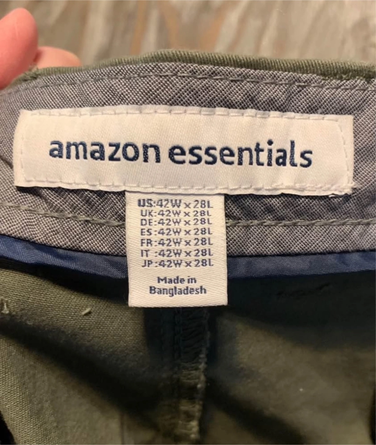 Men's olive green chinos. Size 42W x 28L. New condition. Flat front. Two front pockets and two back pockets. Button closure.