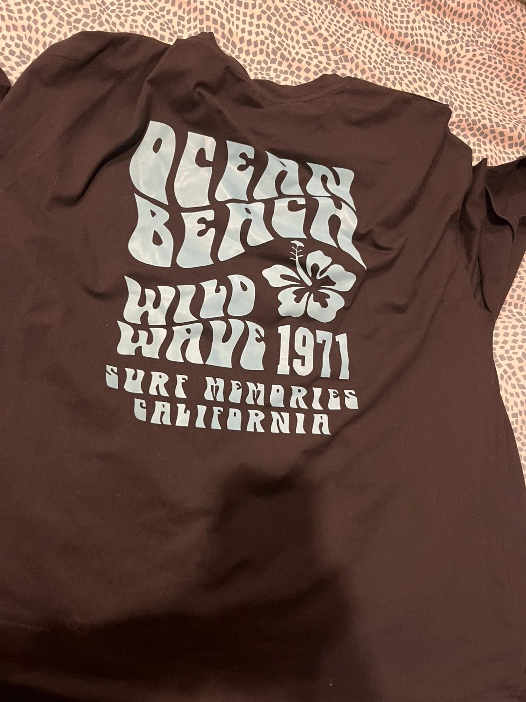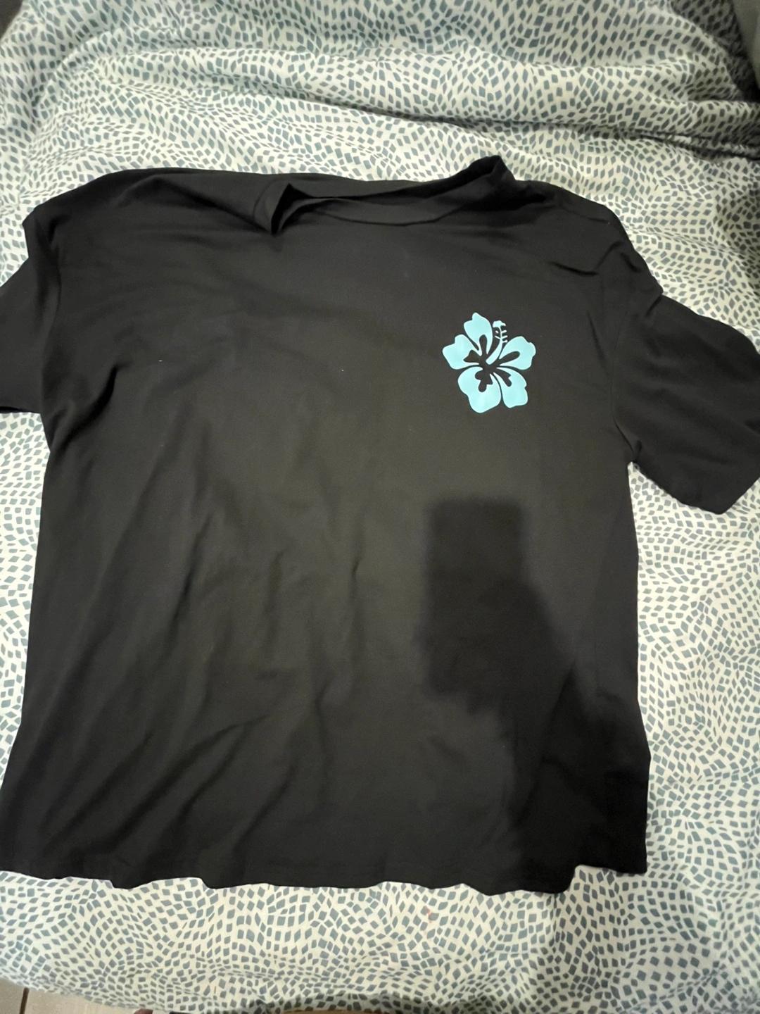 2: Men's or women's black t-shirt. Features two unique designs: one with ocean-themed text and a hibiscus flower, the other with a turtle and beach scene. Short sleeves. Relaxed fit.