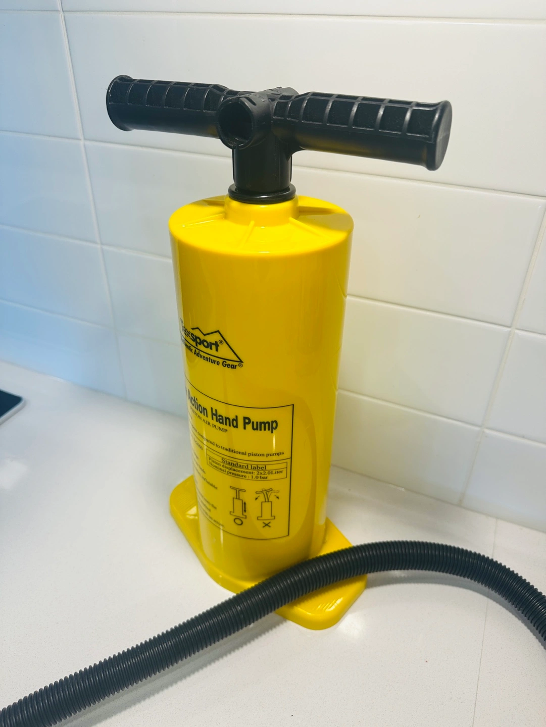 Yellow double action hand pump. Features a flexible hose. Great for inflating air mattresses and other inflatables. sell for $5
