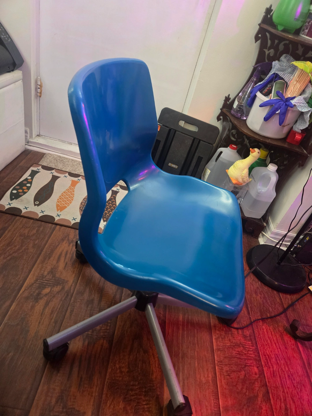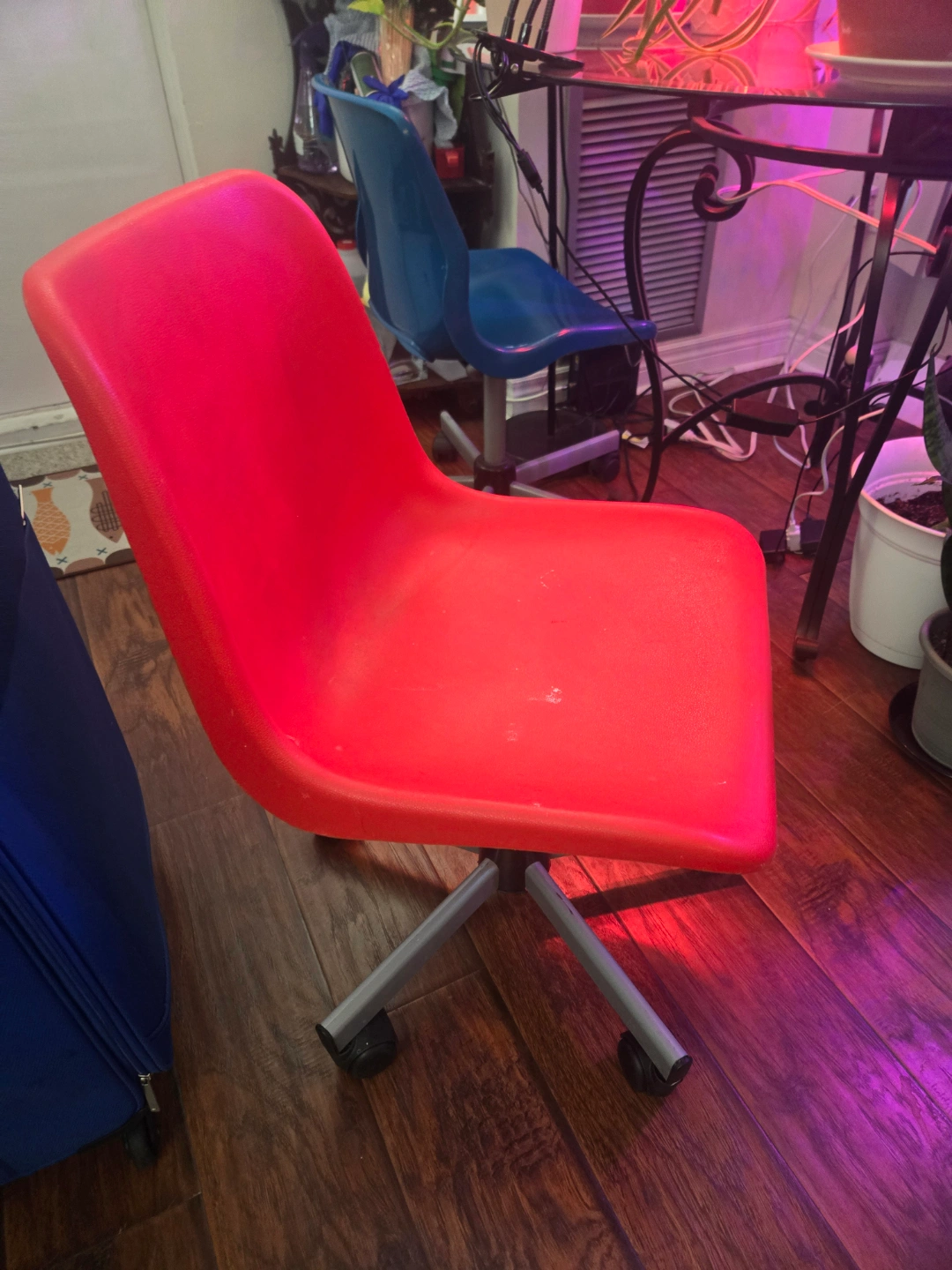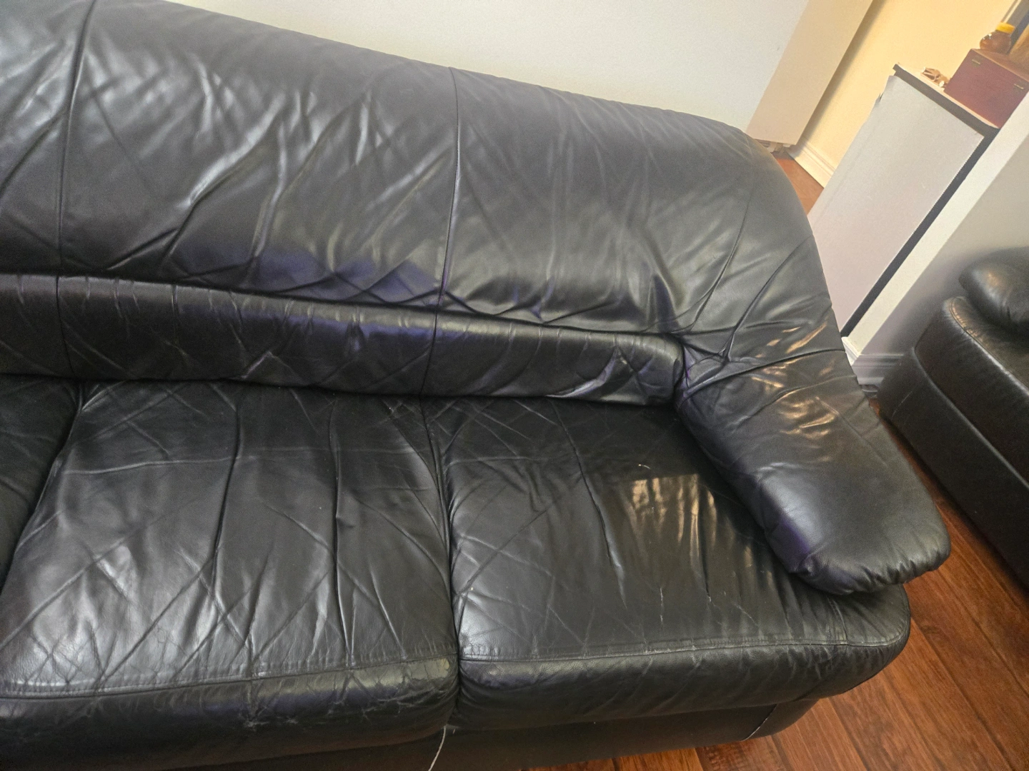 Black leather sofa, some wear and tear. Two swivel chairs, one blue, one red. minor scuffs as seen on pic. $30for all