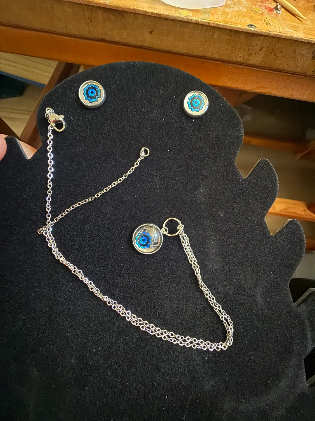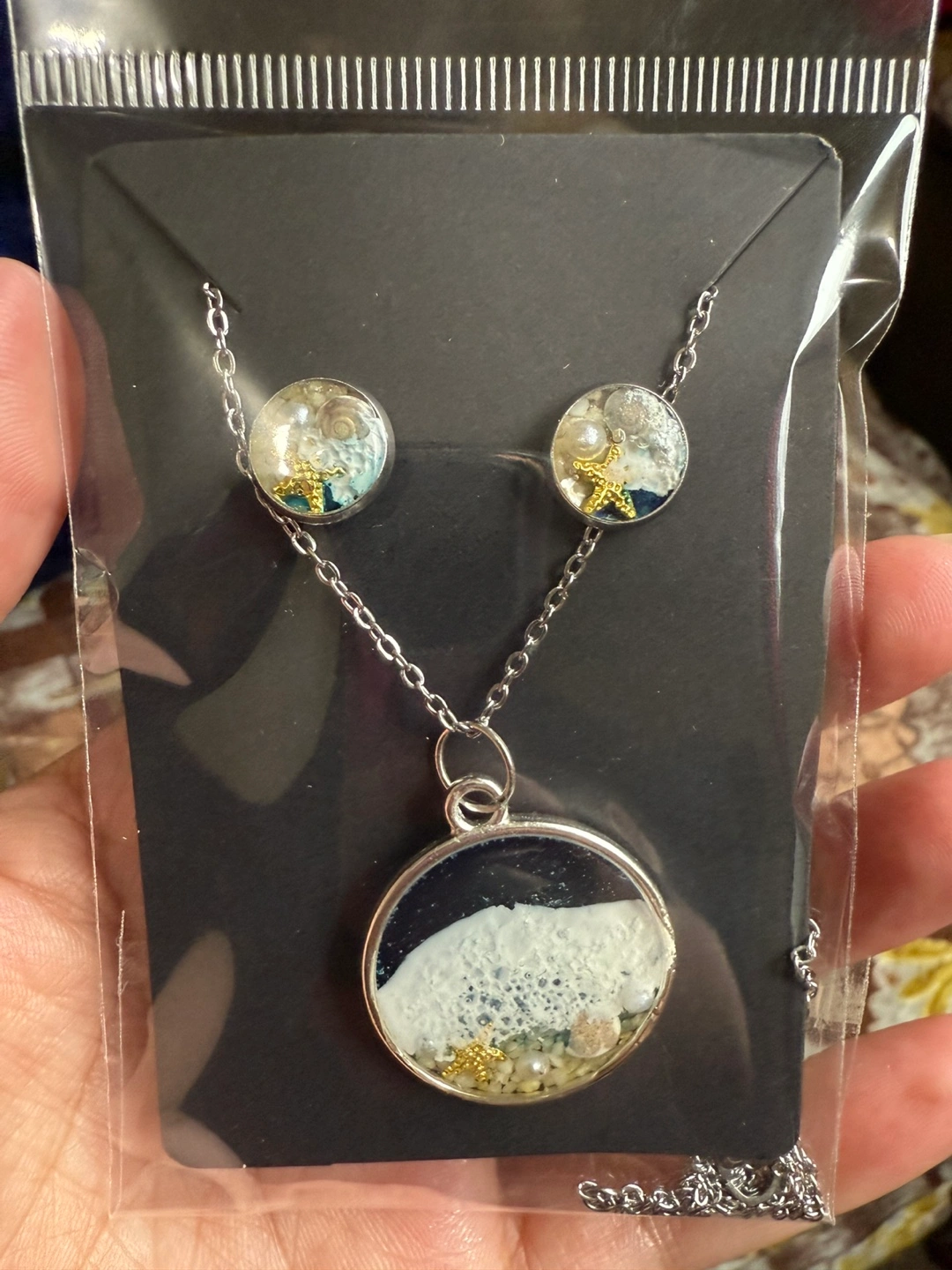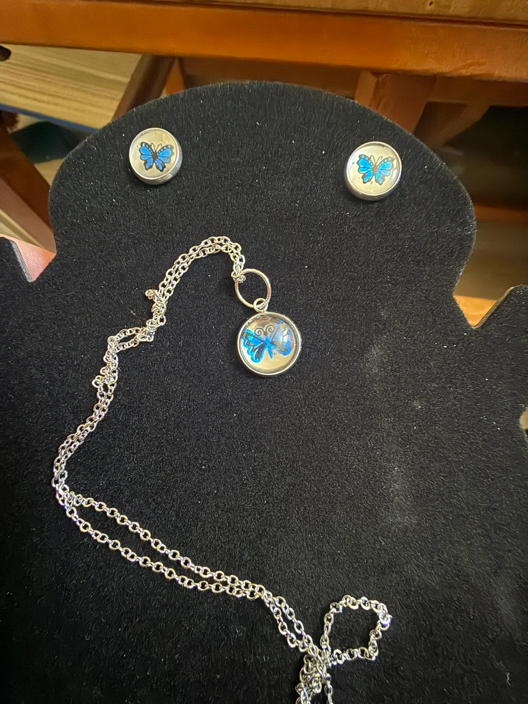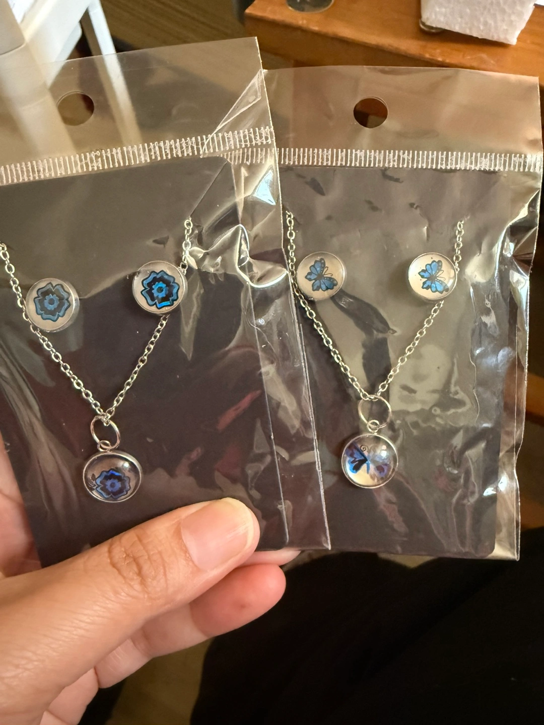Handmade Three beautiful jewelry sets. Each set $10. Each set includes a necklace and a pair of earrings. Features different designs: floral, butterfly, and ocean themes. Silver-toned chains and round pendants. Perfect for adding a touch of elegance to any outfit. Pick up Louelda st near to Concordia hospital