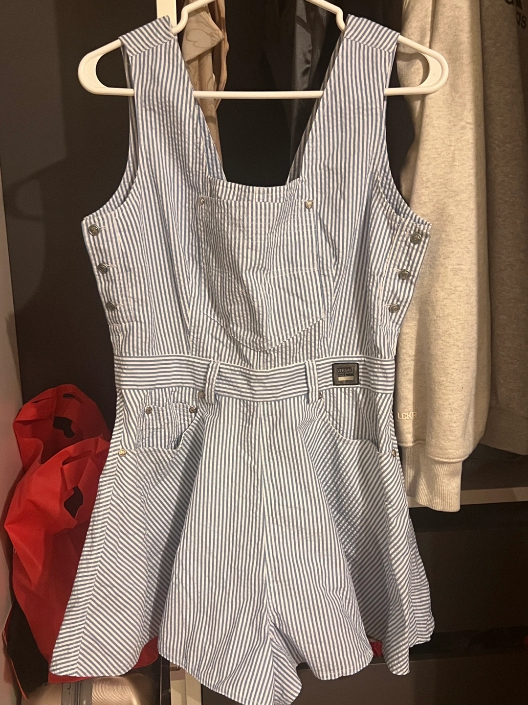 Blue and white striped cotton romper. Sleeveless, A-line silhouette. Features a zipper closure and button detailing. Classic Versace Jeans Couture label.
