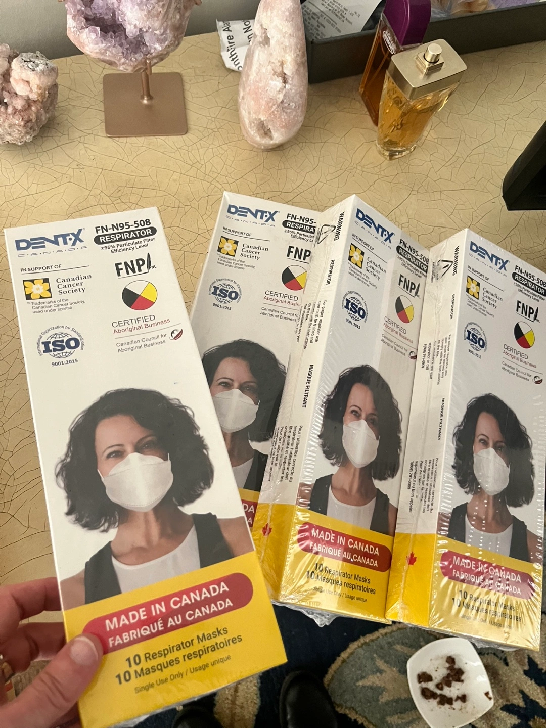 Four boxes of Dentx FN95-508 respirators. Ten masks per box. Single-use only. Made in Canada. 99% particulate filter efficiency. Packaging shows expiry date of 08/27/2026.