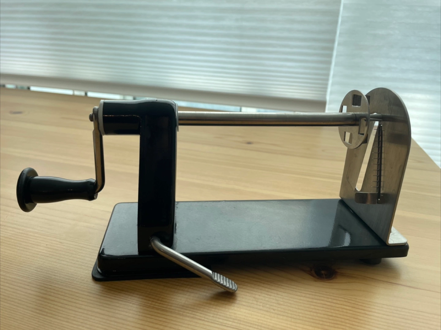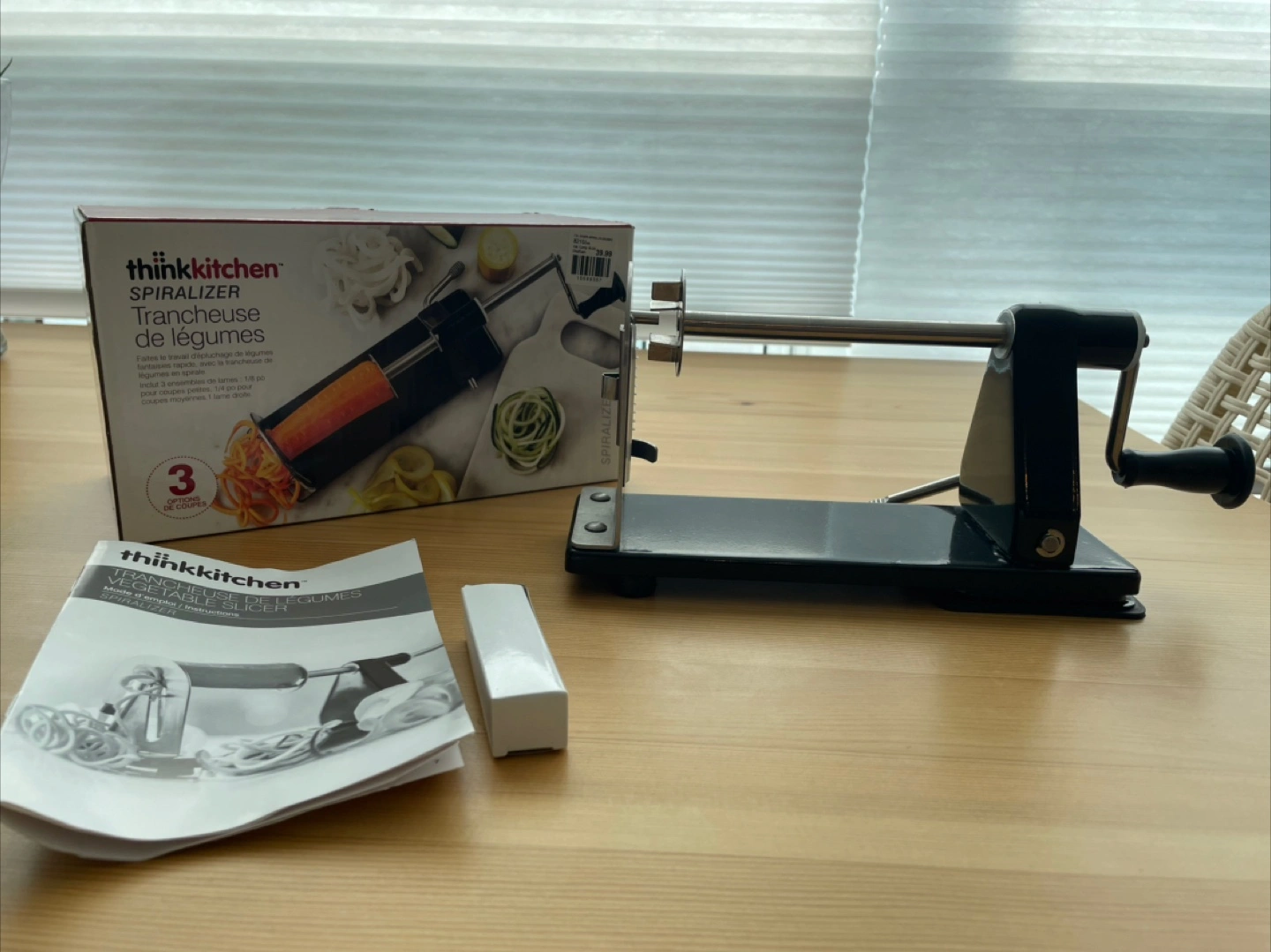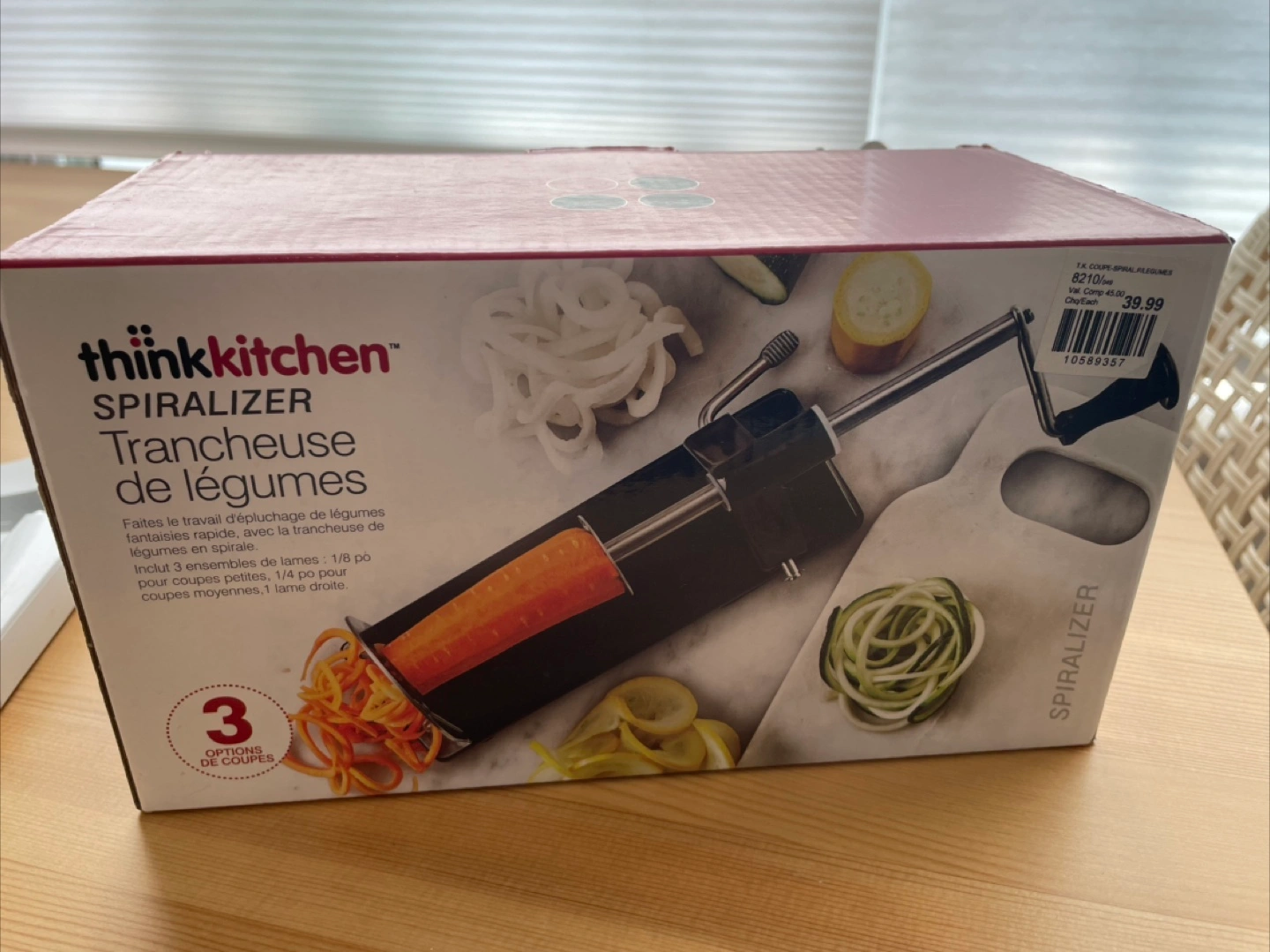New in box. Three cutting options. Hand-crank vegetable spiralizer. Includes instructions.