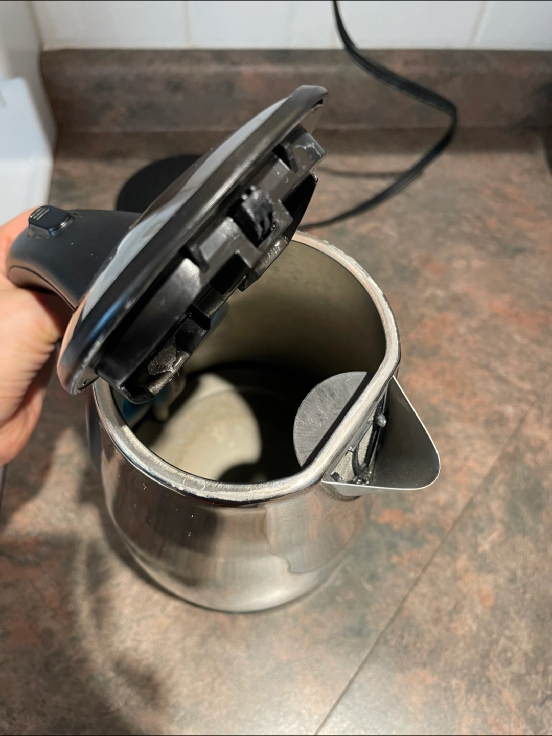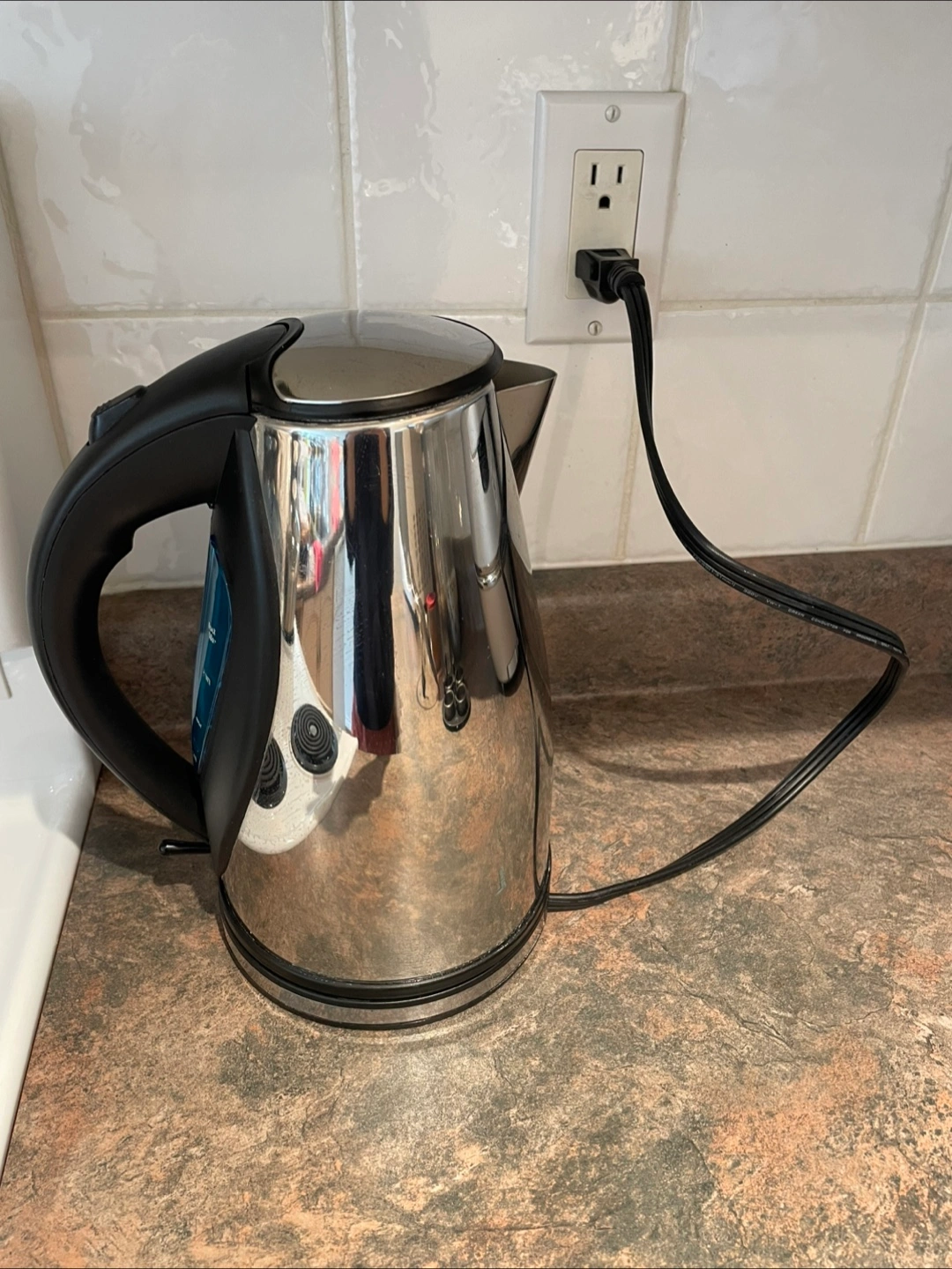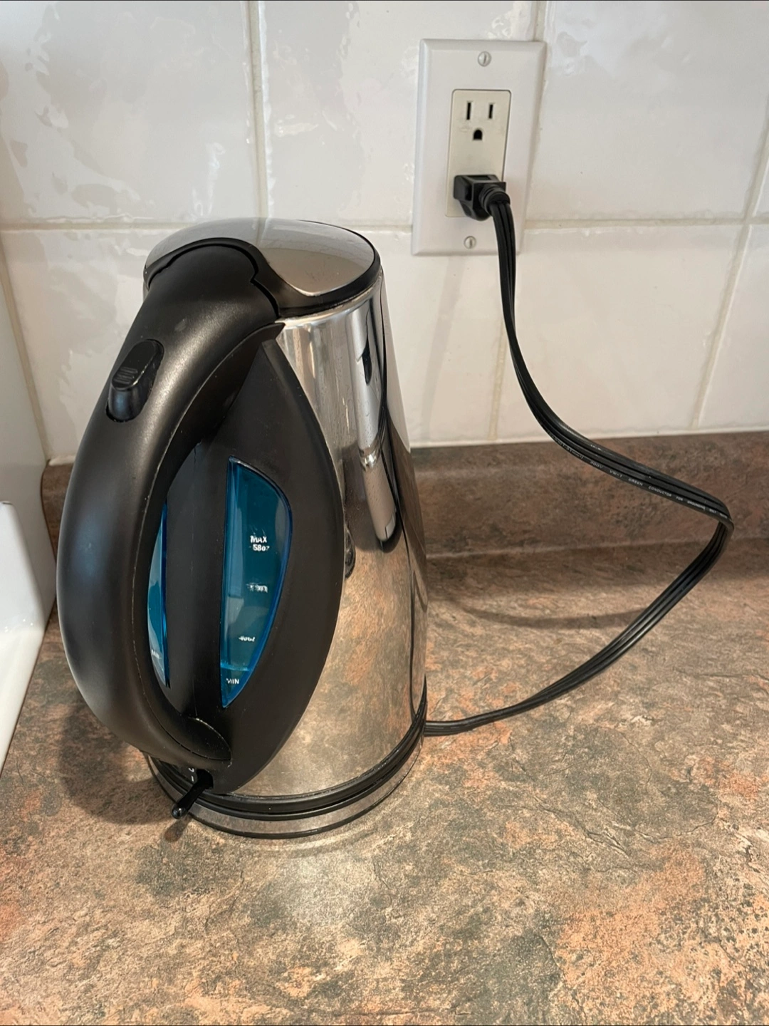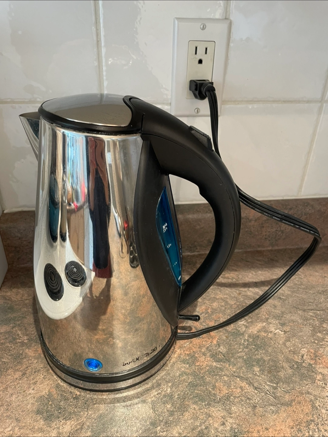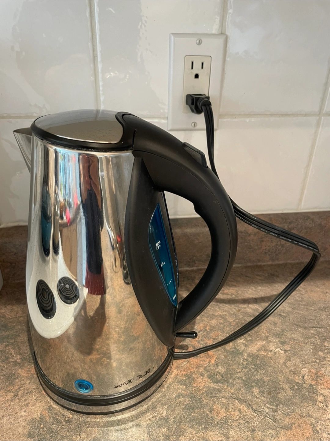 Stainless steel electric kettle. Black handle and base. Water level indicator. Used condition.
