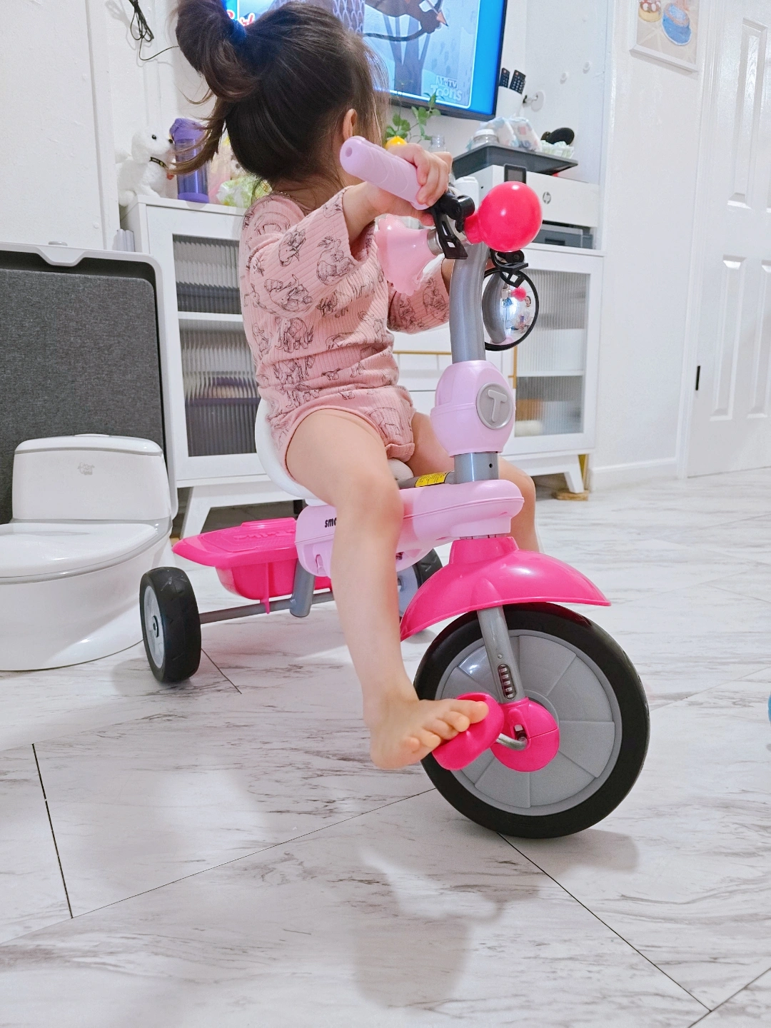 Adorable pink tricycle for toddlers. Features include a bell, rearview mirror, and storage compartment. Great condition. Perfect for little ones learning to ride.