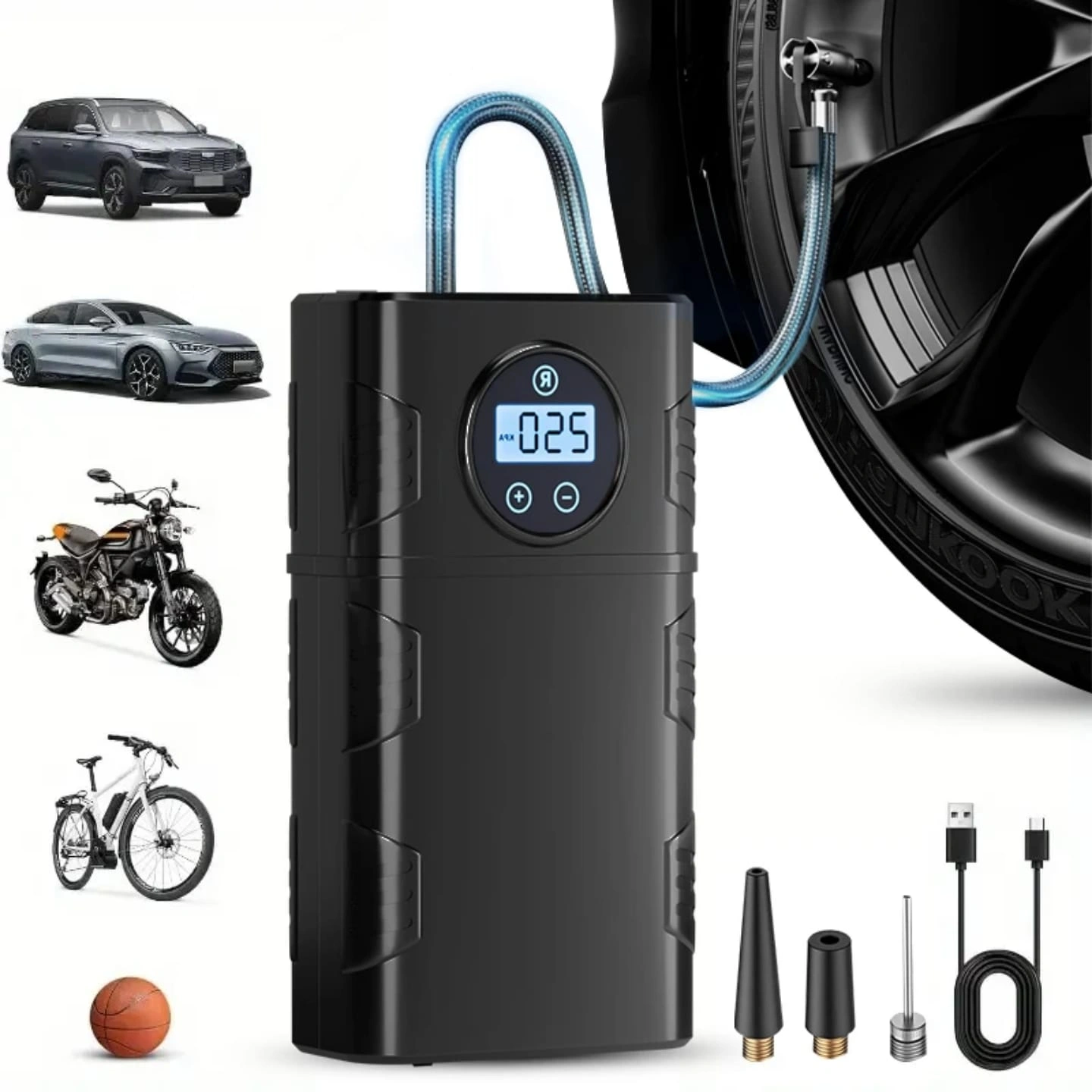 Portable wireless air pump. Inflates car, motorcycle, bicycle, and ball tires. Features digital display and multiple nozzles. Great for emergencies.
