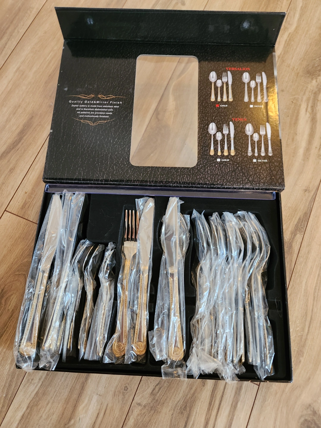 New in box, 24-piece cutlery set. Versace design. Gold and mirror finish. Includes six each of dinner spoons, dinner forks, tea spoons, and dinner knives. Stainless steel.