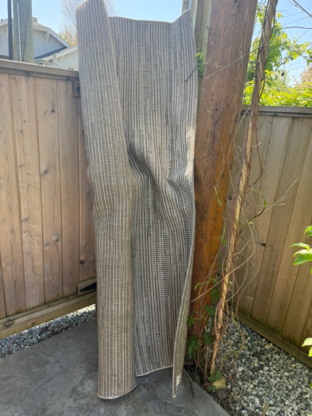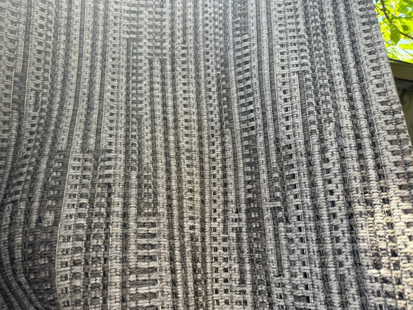 FREE outdoor area rug. Approx. 8’ x 10’. Neutral colours (black/grey/cream).