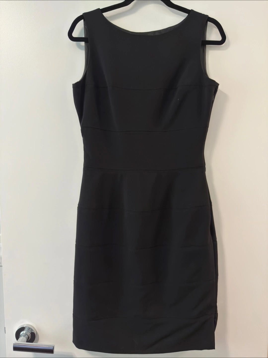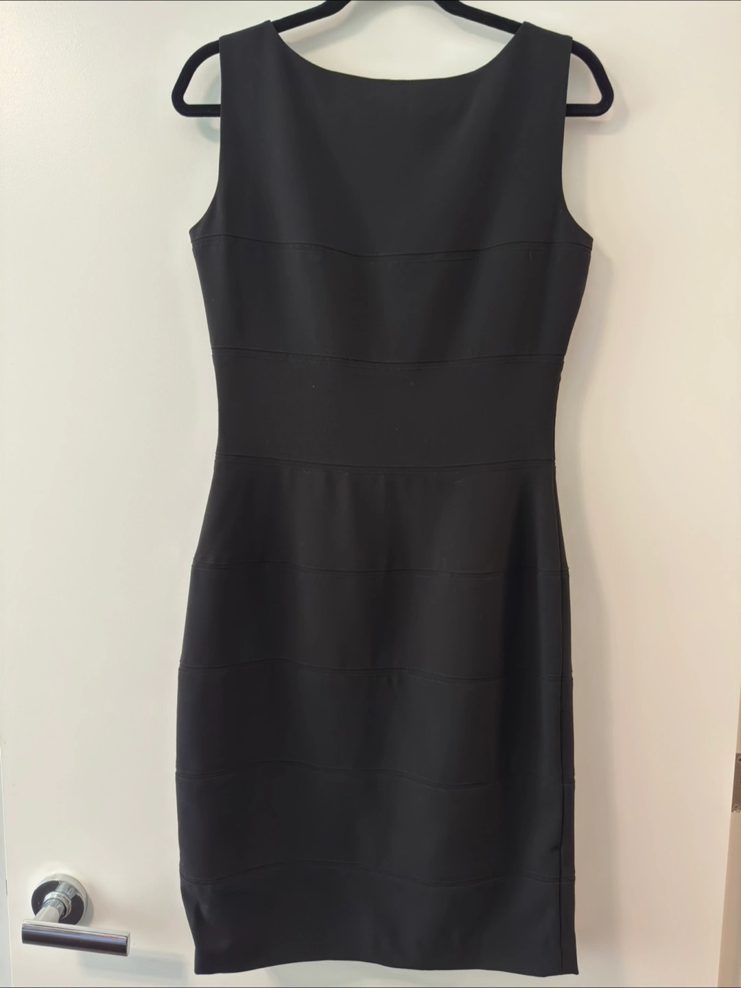 This is a Calvin Klein sheath dress in a little black dress style. It is a size 6 and features a zipper closure, perfect for any occasion. The dress is in almost new, ready to elevate your wardrobe.