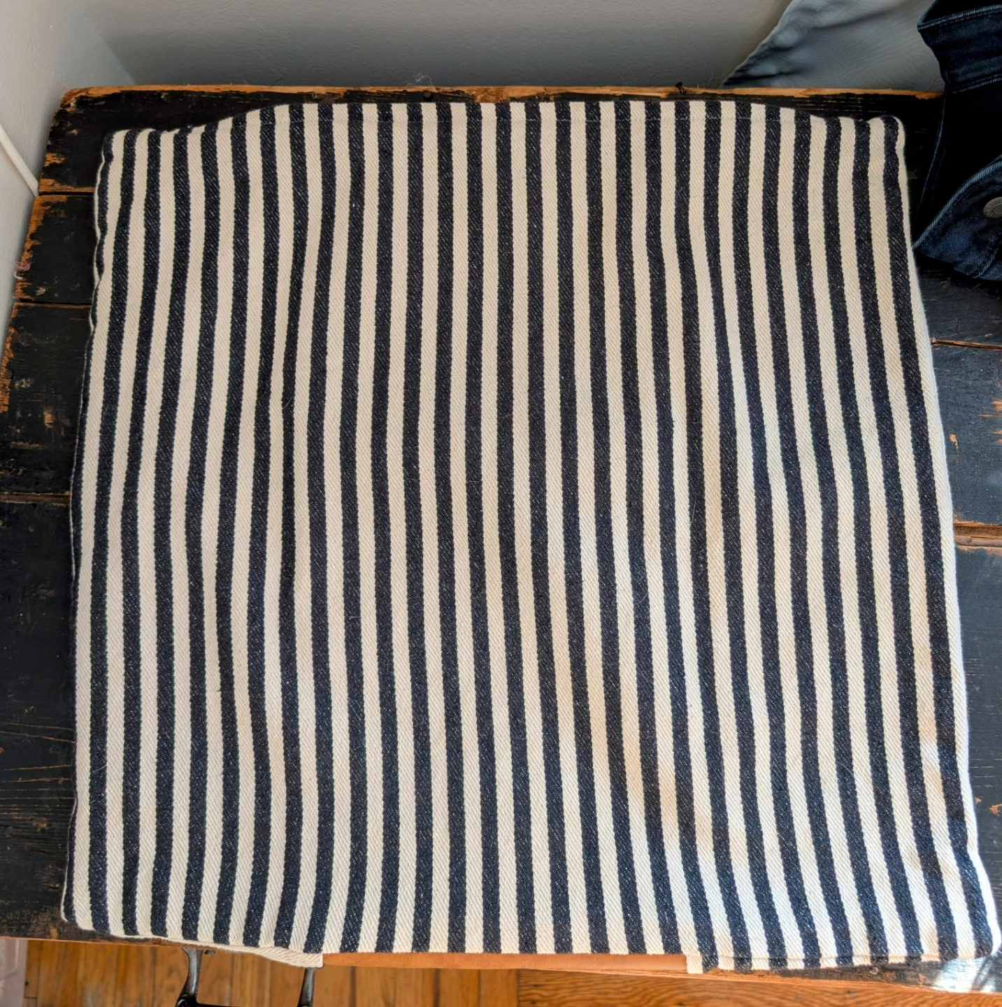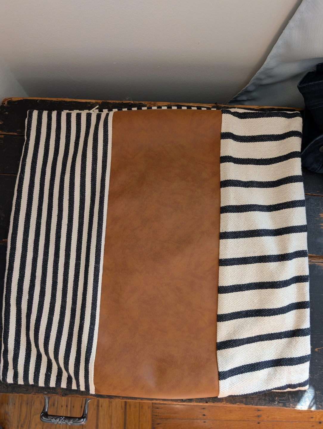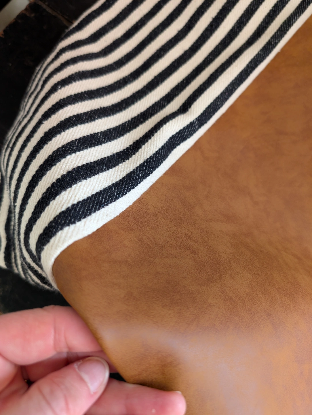 - Dark navy blue (almost looks black) and cream striped, with brown leather panel on one side