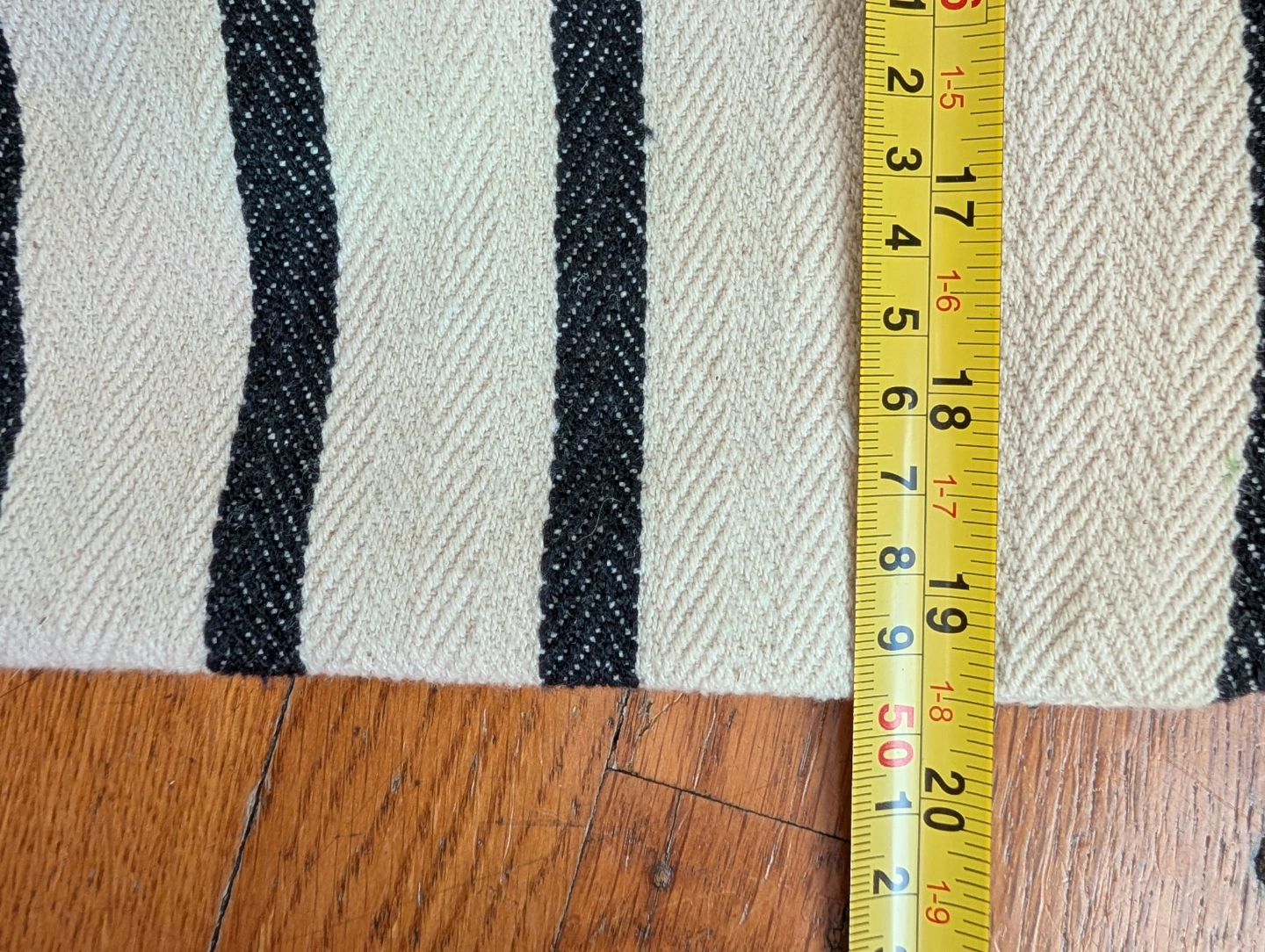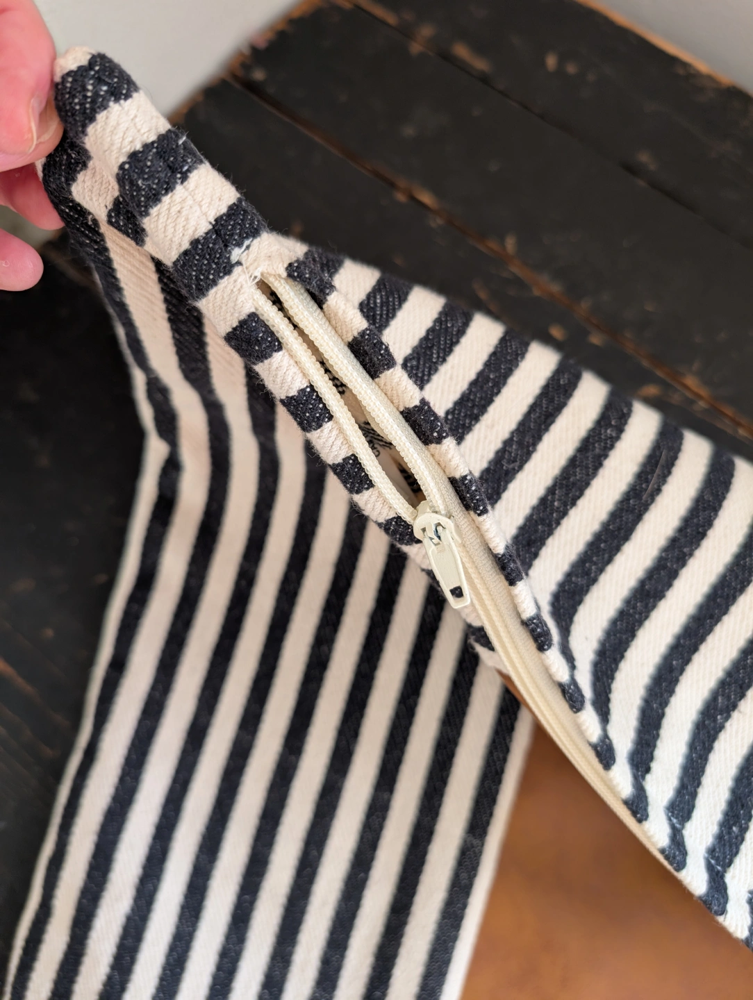 - Dark navy blue (almost looks black) and cream striped, with brown leather panel on one side