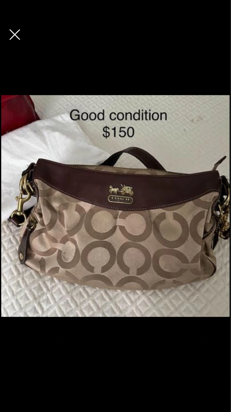 Beige canvas with brown leather trim. Signature Coach pattern. Good condition. $90