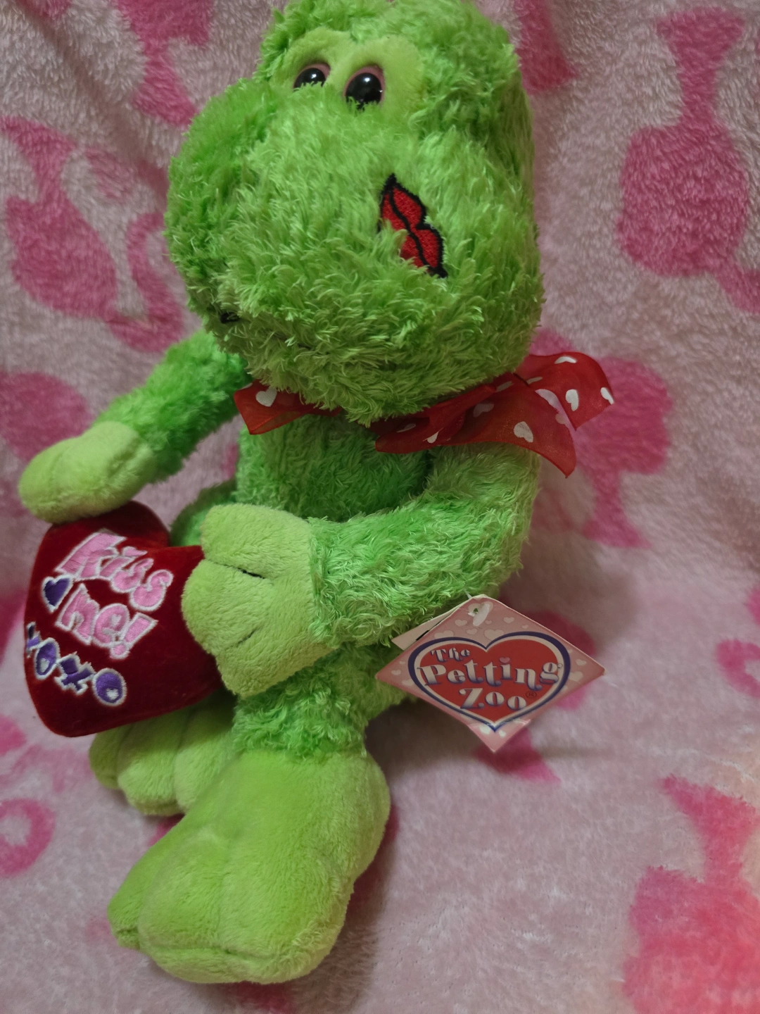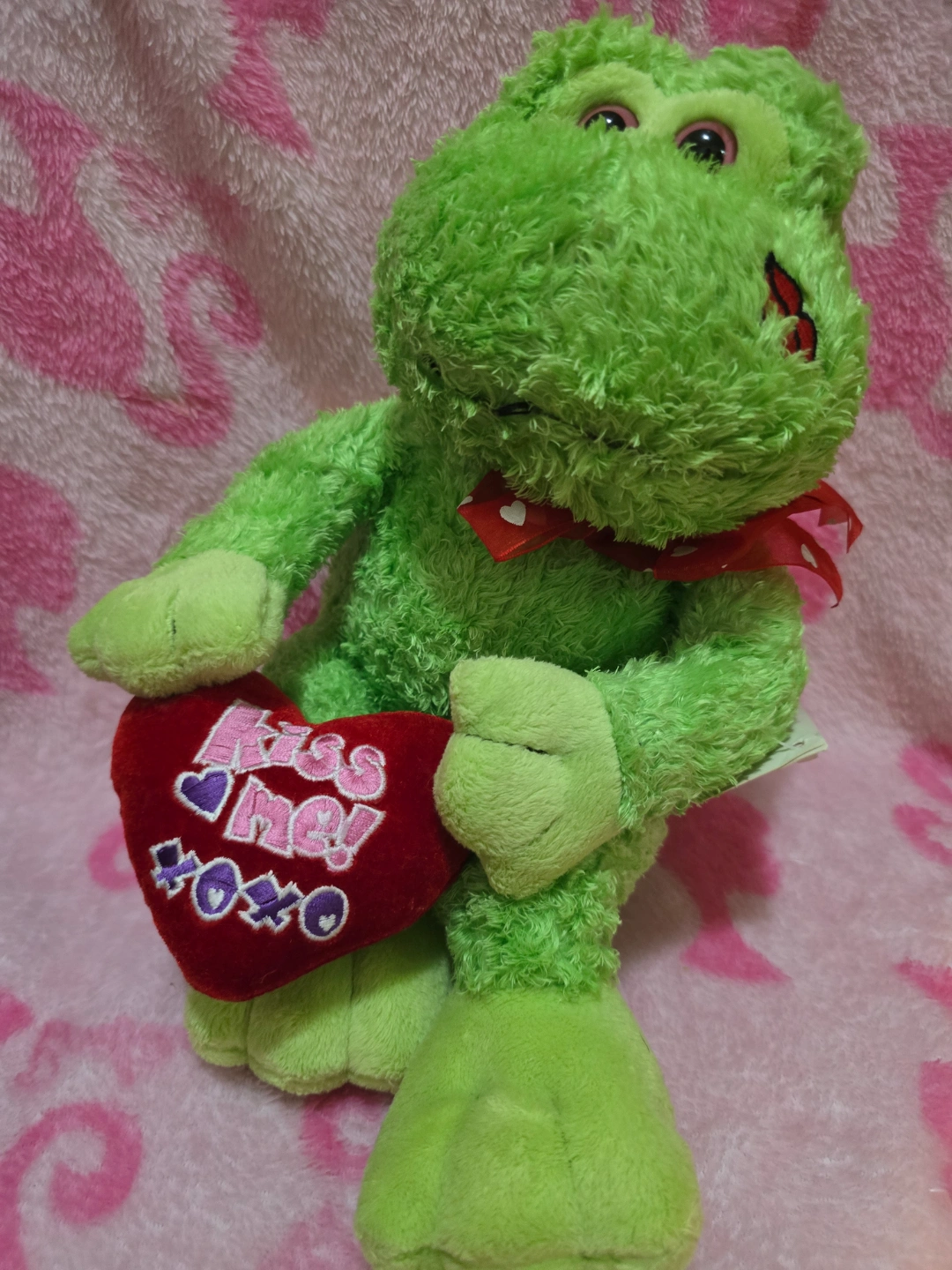 1000+Adorable lime green frog plush. Holds a red heart that says "Kiss Me". Red and white polka dot ribbon around neck.