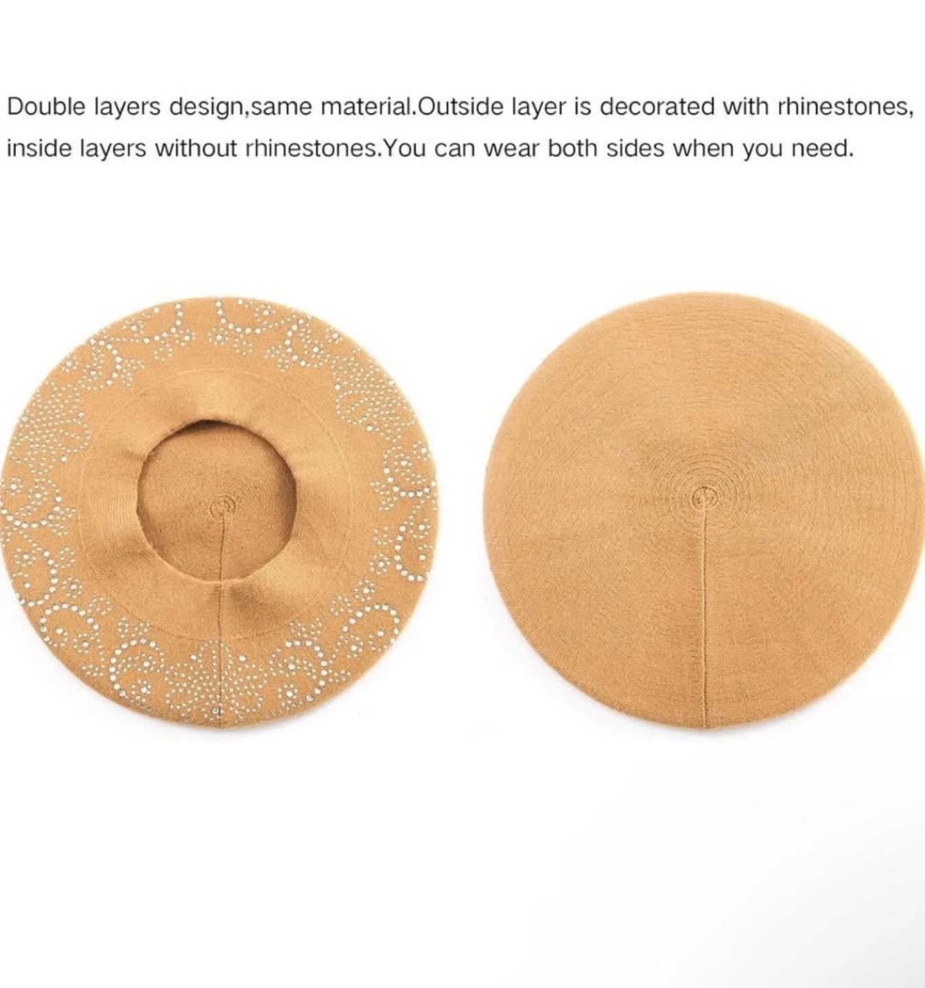 433Double layered wool beret. Features rhinestones on the outer layer. Tan colour. Warm and comfortable. Its new still inside the box.