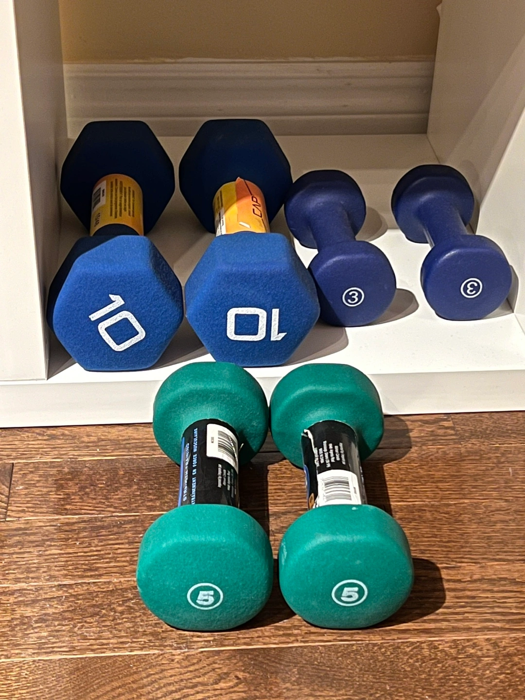Set of three neoprene dumbbells. Two 10 lb blue dumbbells, two 3 lb blue dumbbells, and two 5 lb green dumbbells. Good condition.