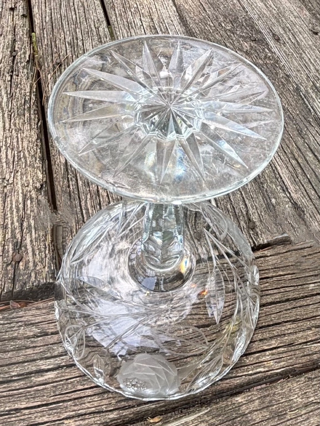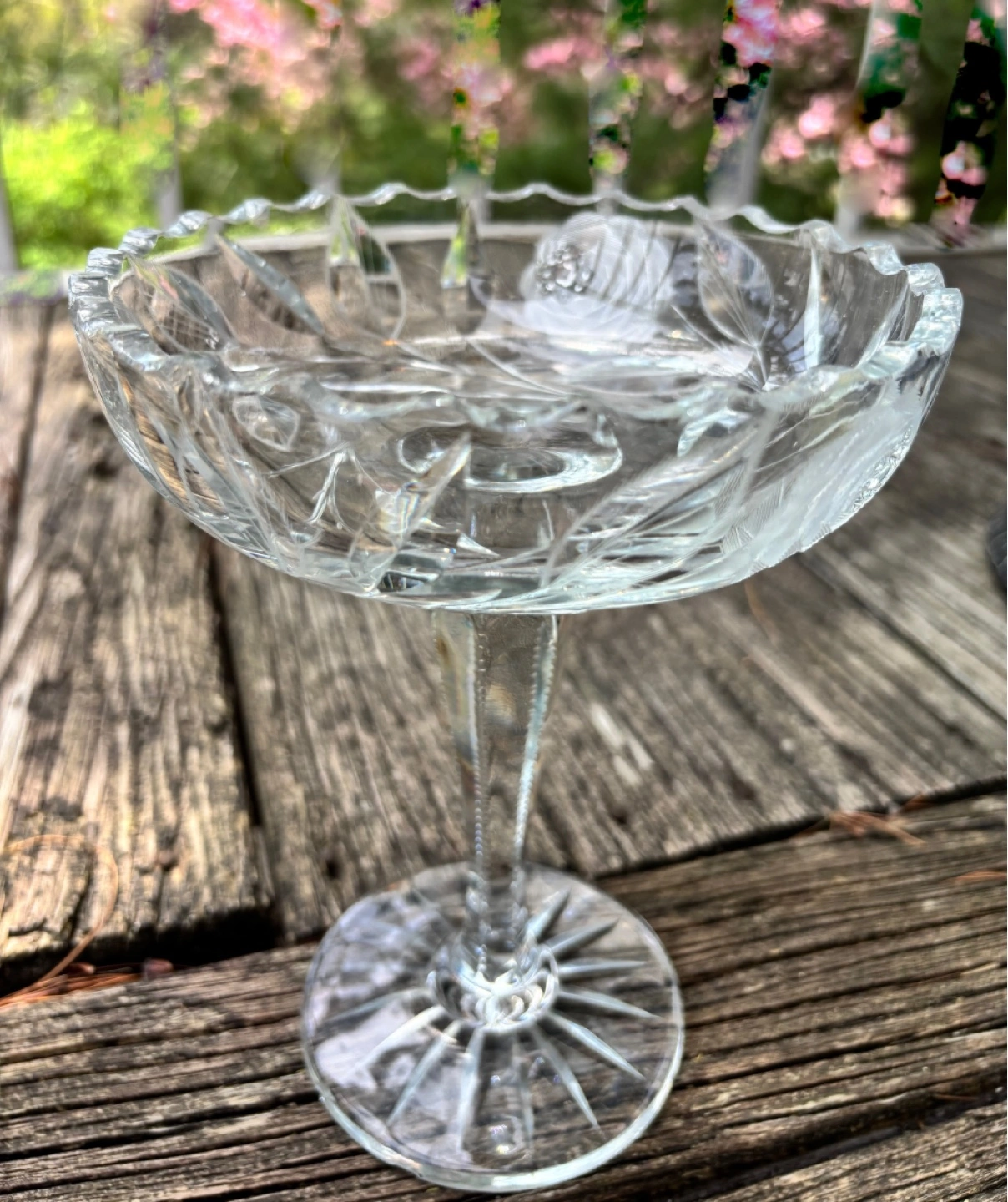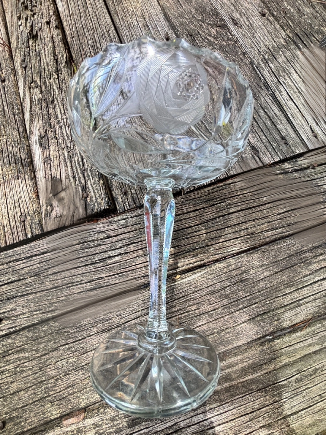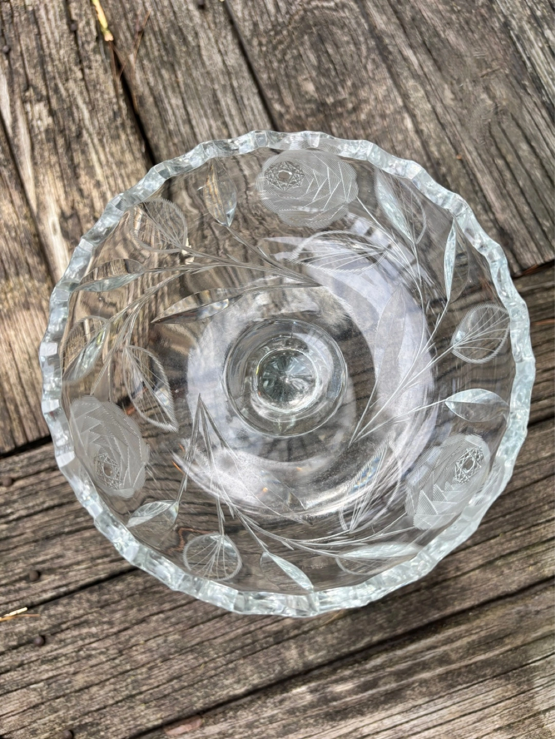 Vintage Cut Glass Pedestal Dish with Frosted Floral Etchings