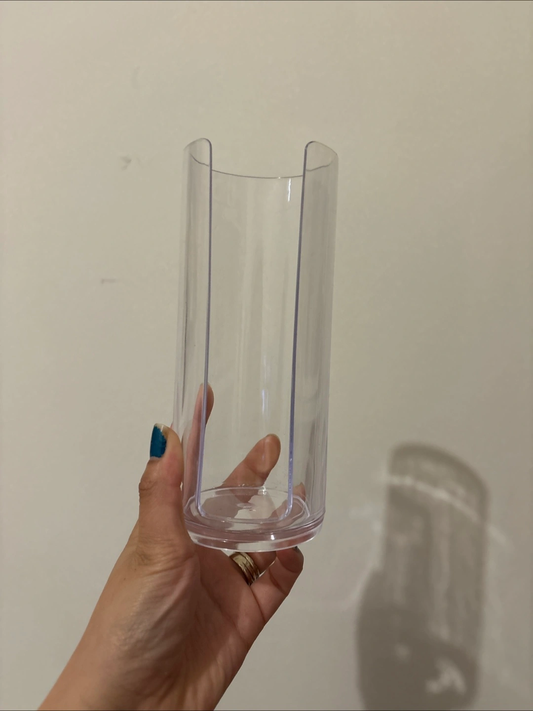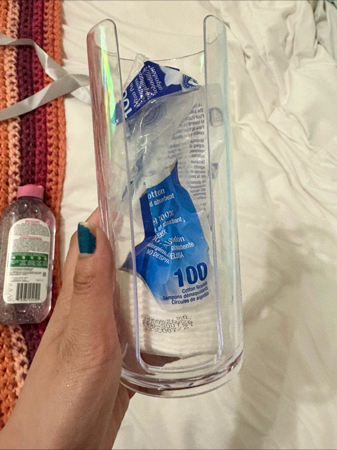 Cute clear acrylic cotton round container. Holds a standard-sized pack of cotton rounds. Perfect for bathroom organization.
