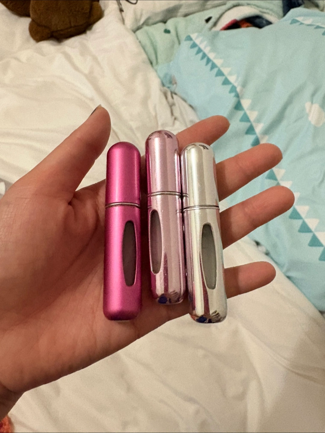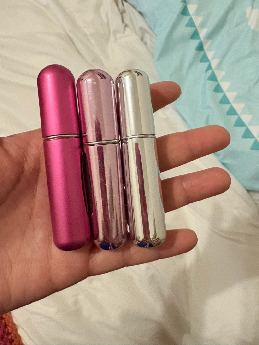 Set of three portable perfume atomizers. Pink, rose gold, and silver. Great for travel or mini purse