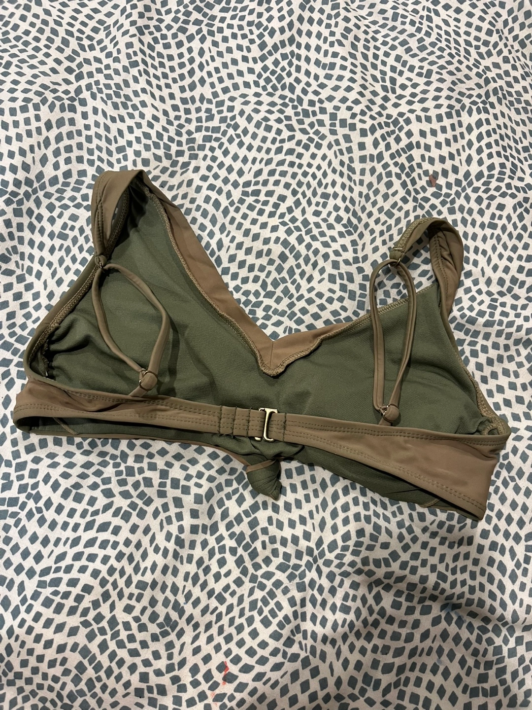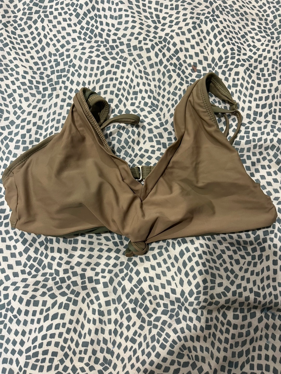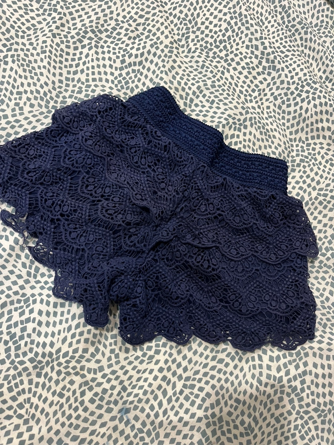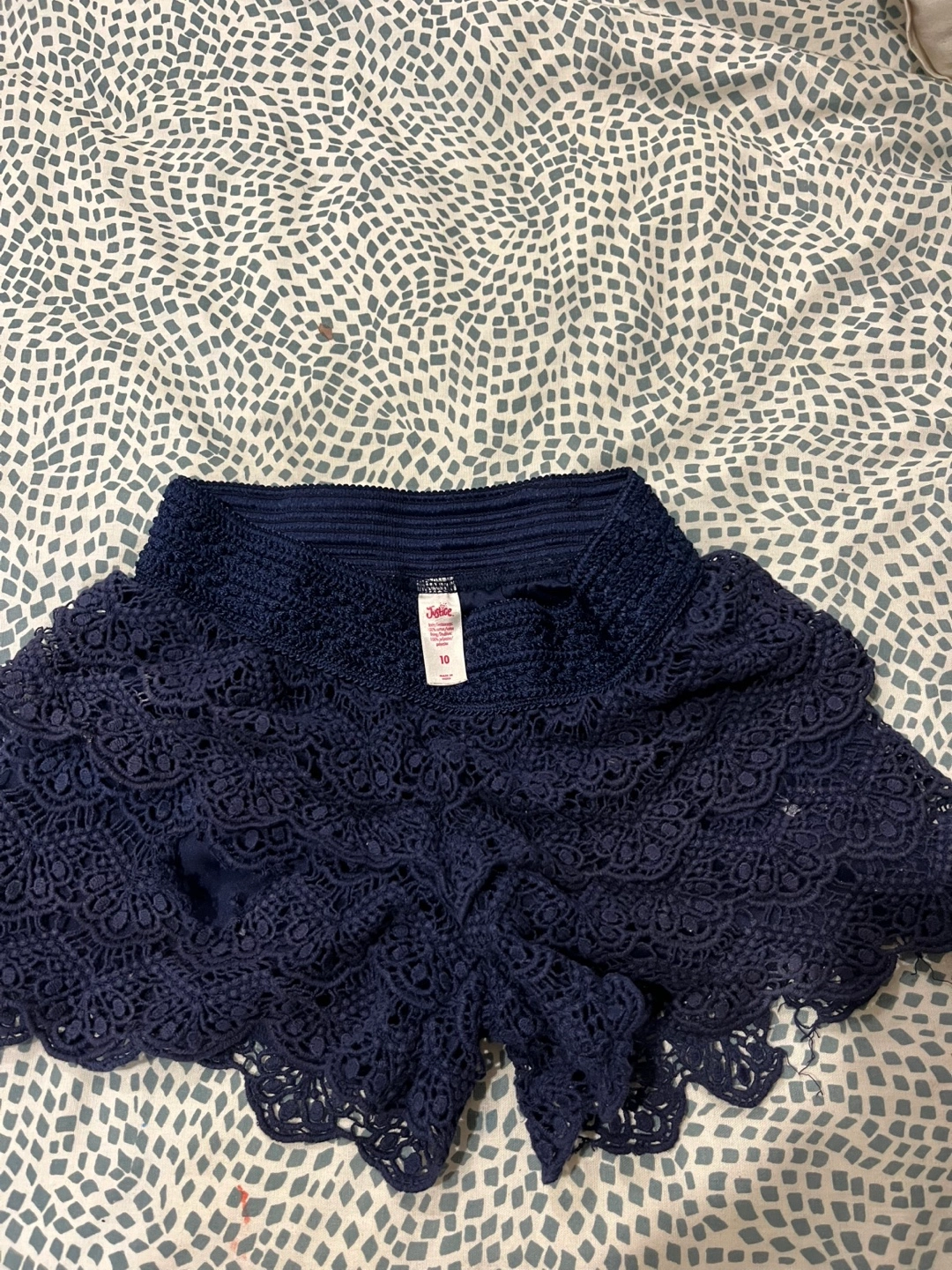 Dark blue lace shorts size 10- $10,Olive green bikini top- $10. Grey joggers- $8, cropped motorcycle top- $7, grey purse- $5, white Calvin Klein- $2