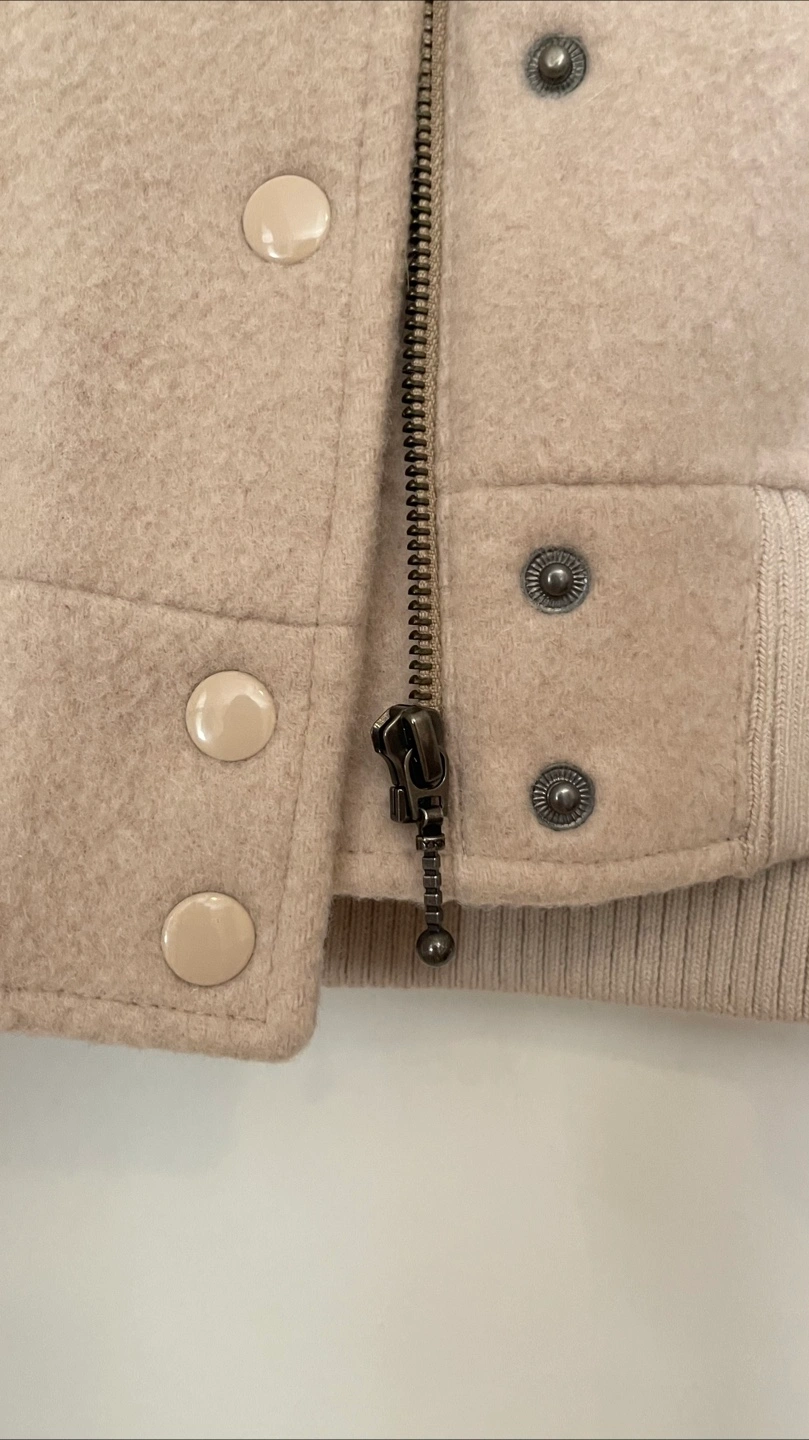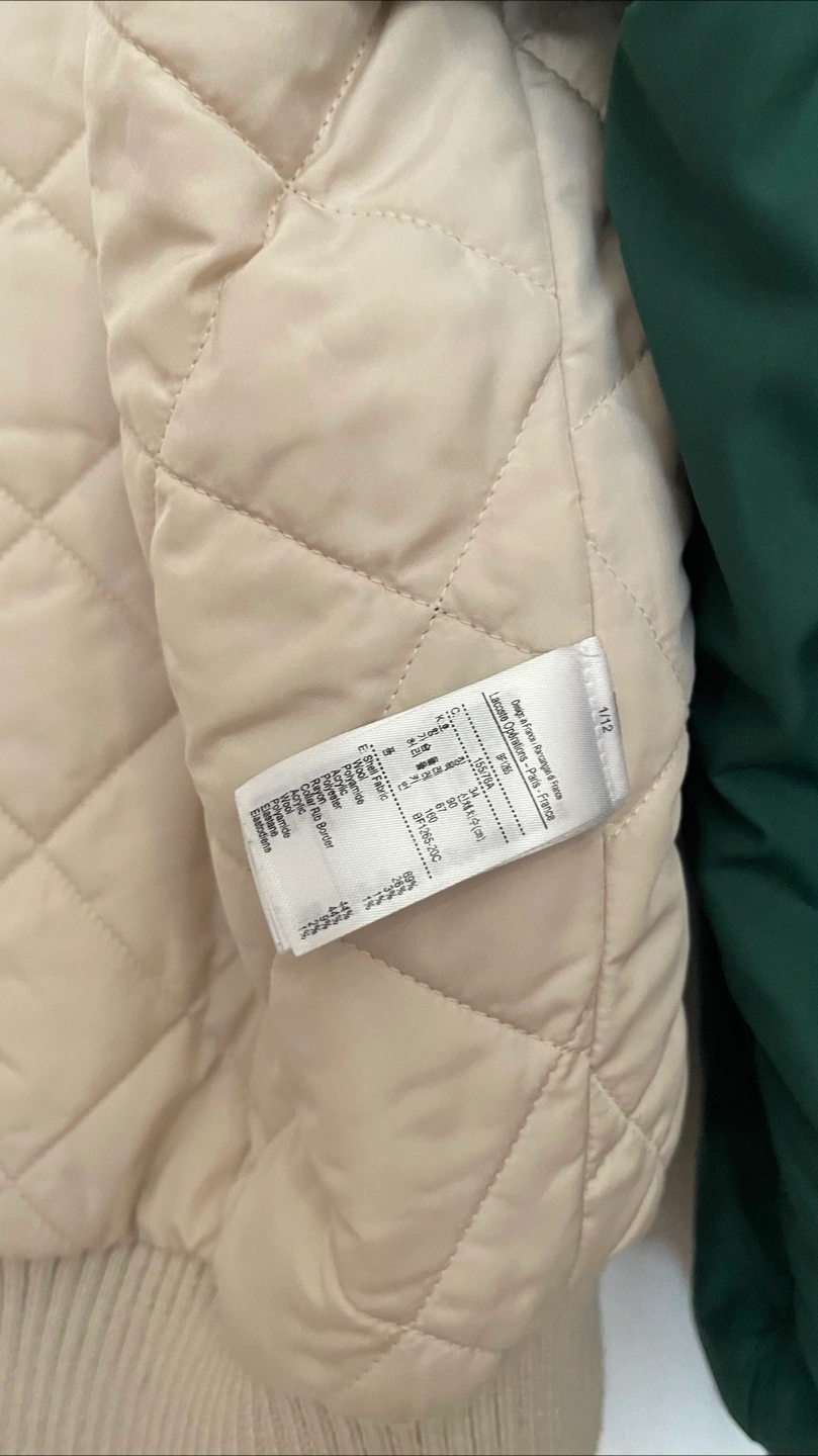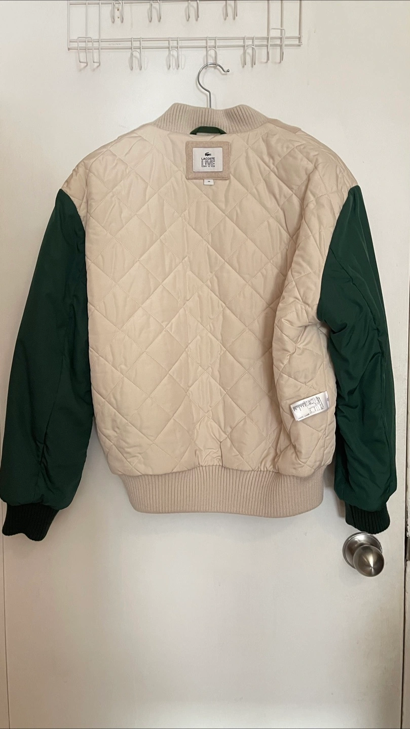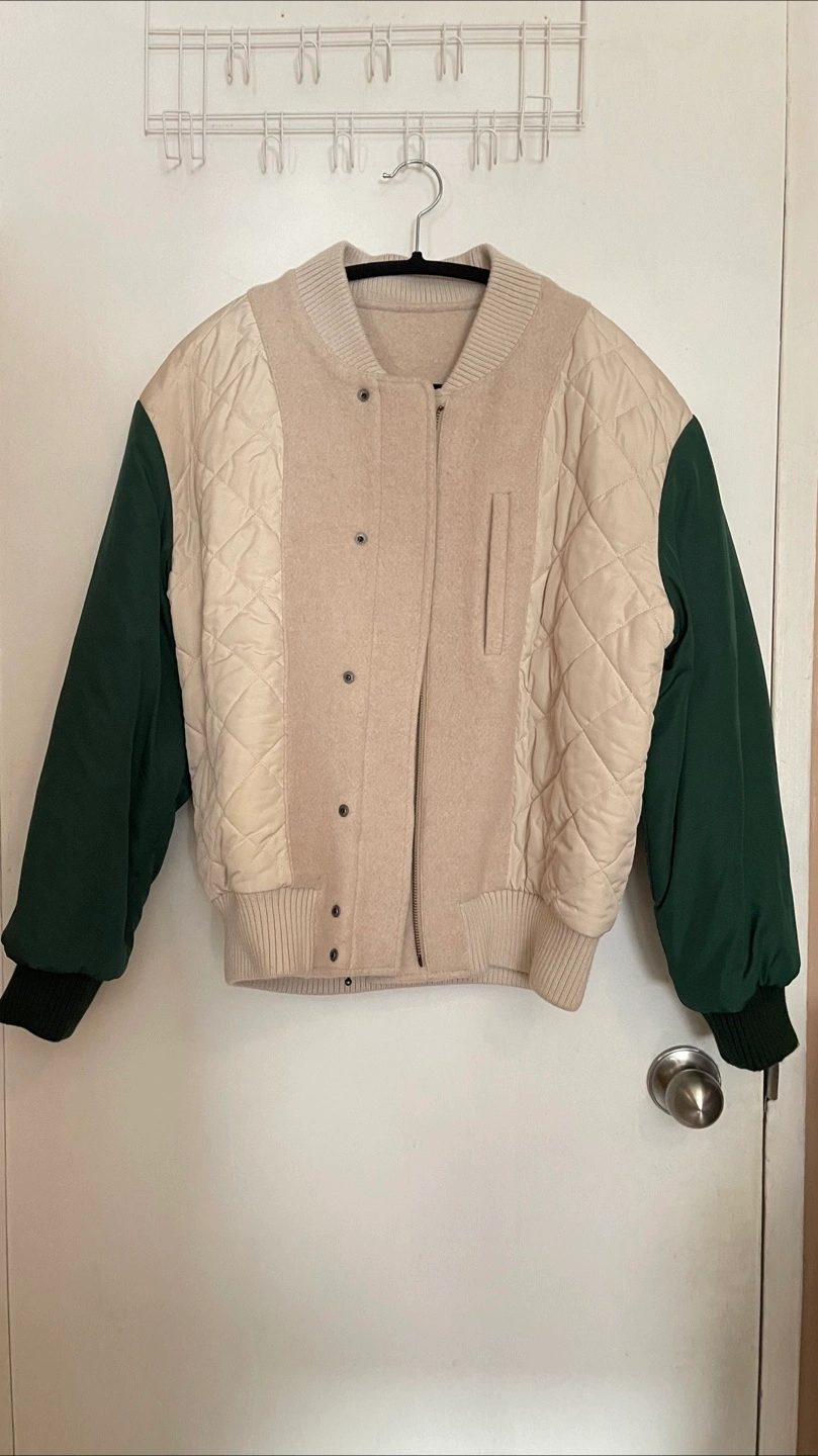 Cream and green bomber jacket. Features quilted detailing and ribbed cuffs. Snap button closure. Never used just kept in closet.