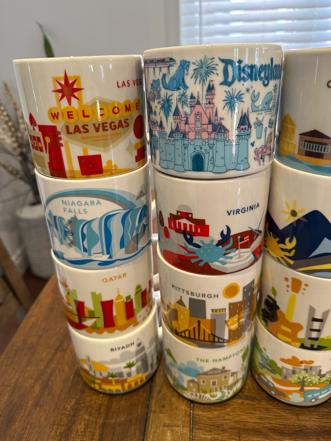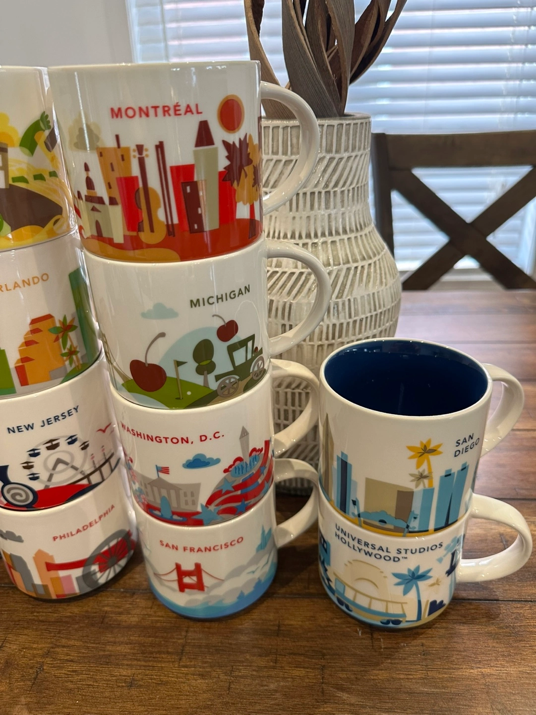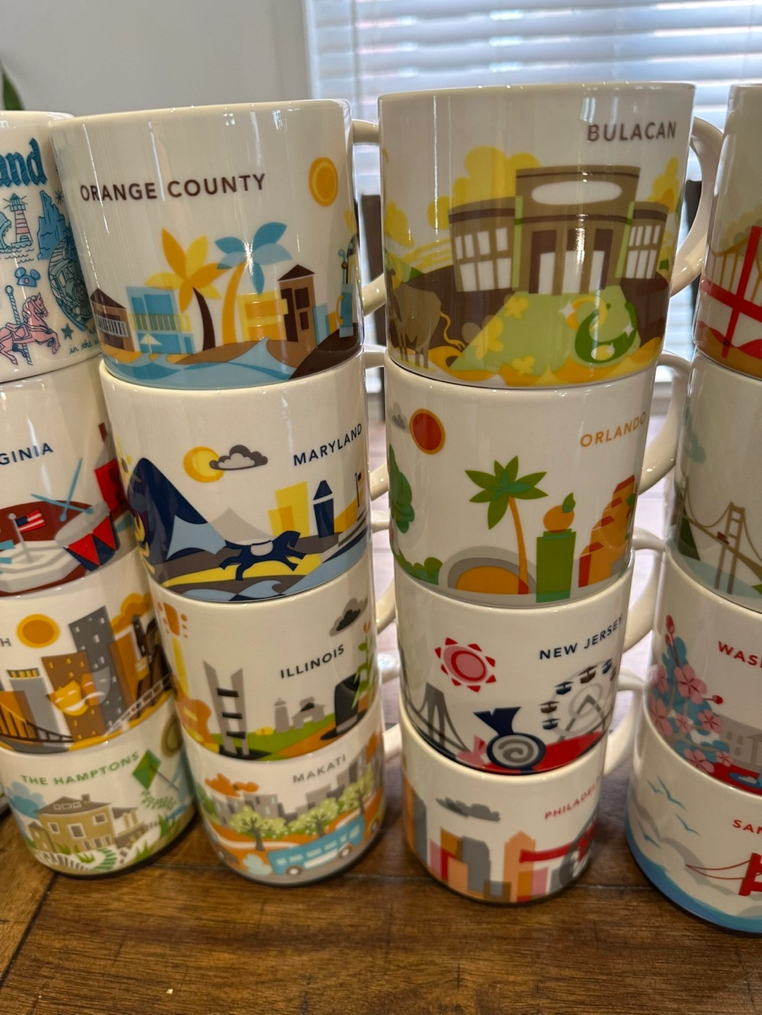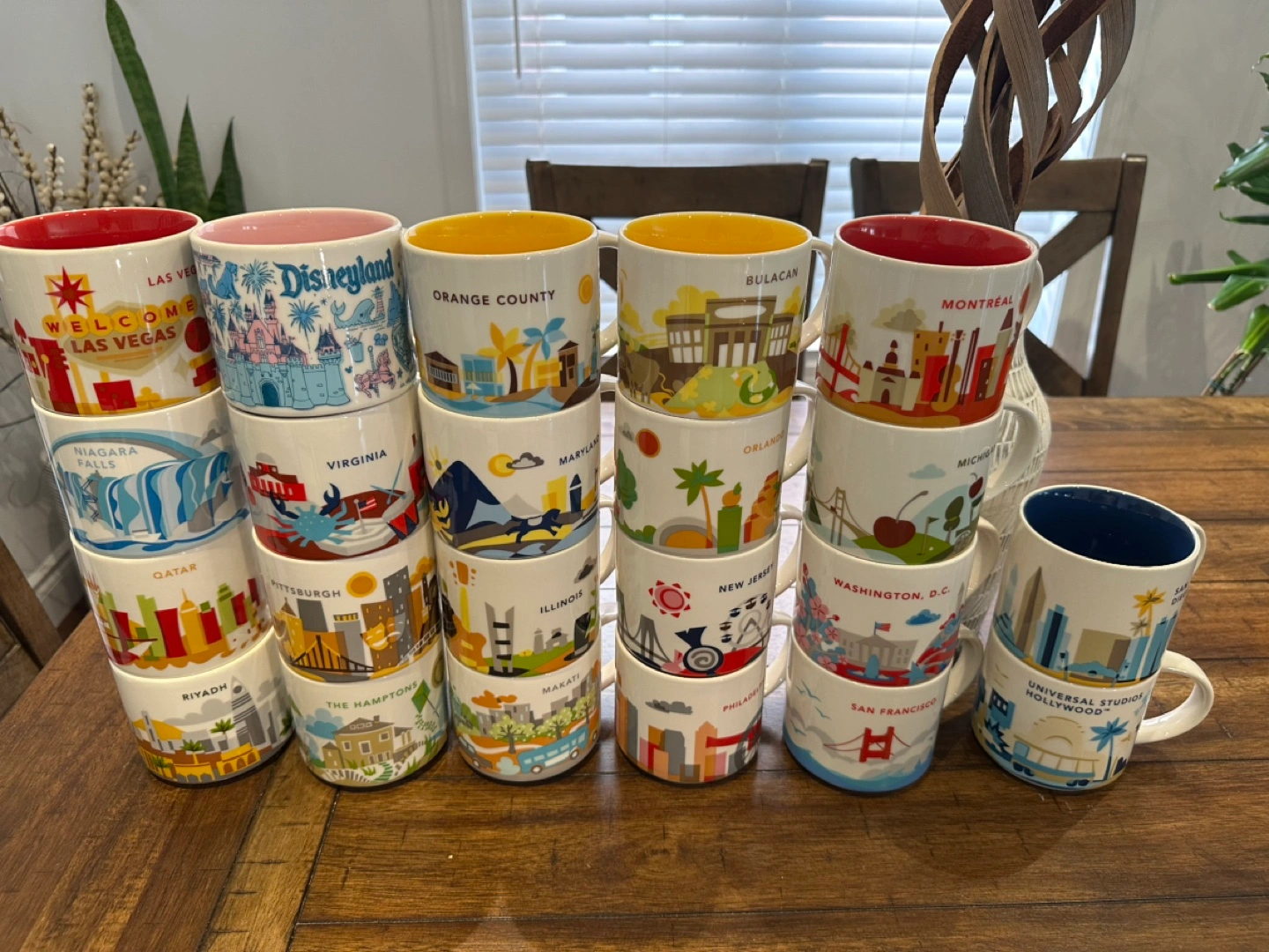 Set of 21 Starbucks city mugs. Each mug features a unique city design. Collectible mugs, great for coffee or display.