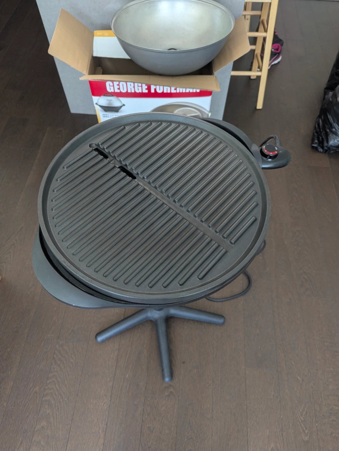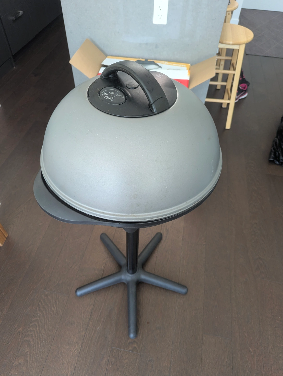 Lightly used George Foreman 15-portion indoor/outdoor electric grill. Includes grilling plate, drip tray, and dome lid. All in original packaging. Great for smaller spaces or patios. Good condition and thoroughly cleaned.