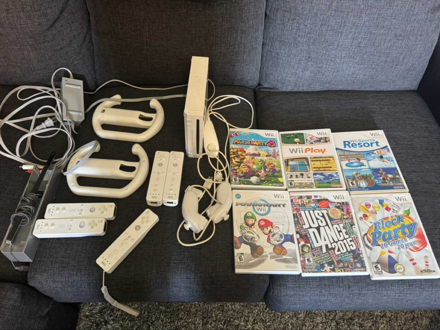 Pre-owned Nintendo Wii console. Includes multiple controllers, nunchucks, Wii wheel accessories, power supply, sensor bar and 8 games. Great for family fun! Firm at $100