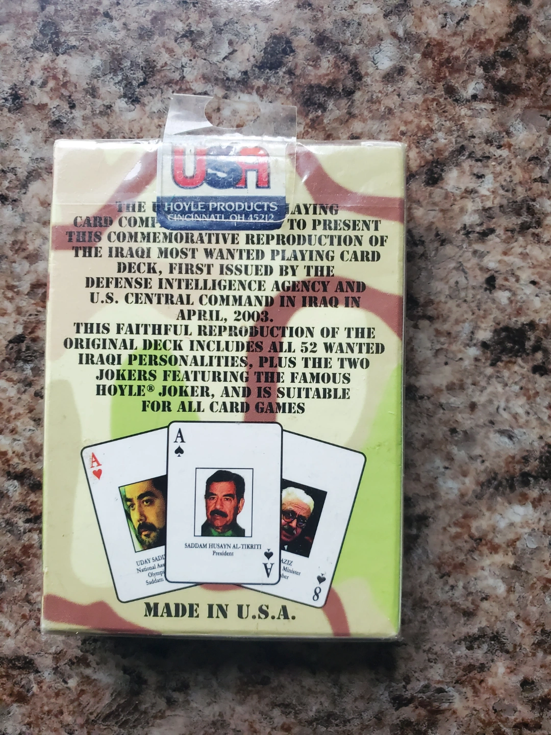 Commemorative reproduction of the Iraqi playing card deck. First issued by the US Central Intelligence Agency in 2003. Features all 52 cards, plus two jokers. Suitable for all card games. Made in the USA.