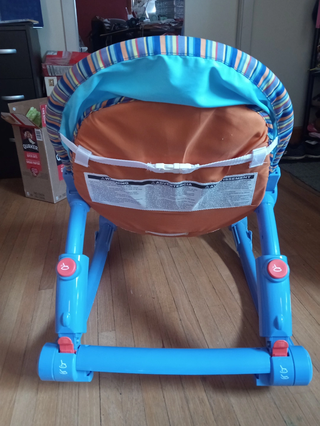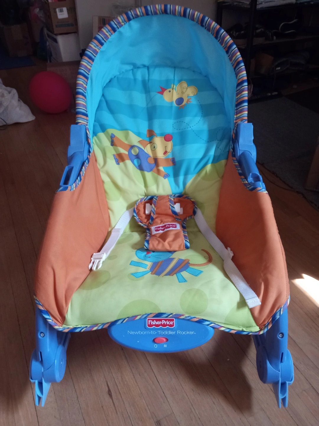 Infant rocker/rocking chair. Blue and orange with cute animal designs. Suitable for newborns and toddlers. Foldable for storage, and height / angle adjustable. Unsure if vibrating feature still works. Good used condition.